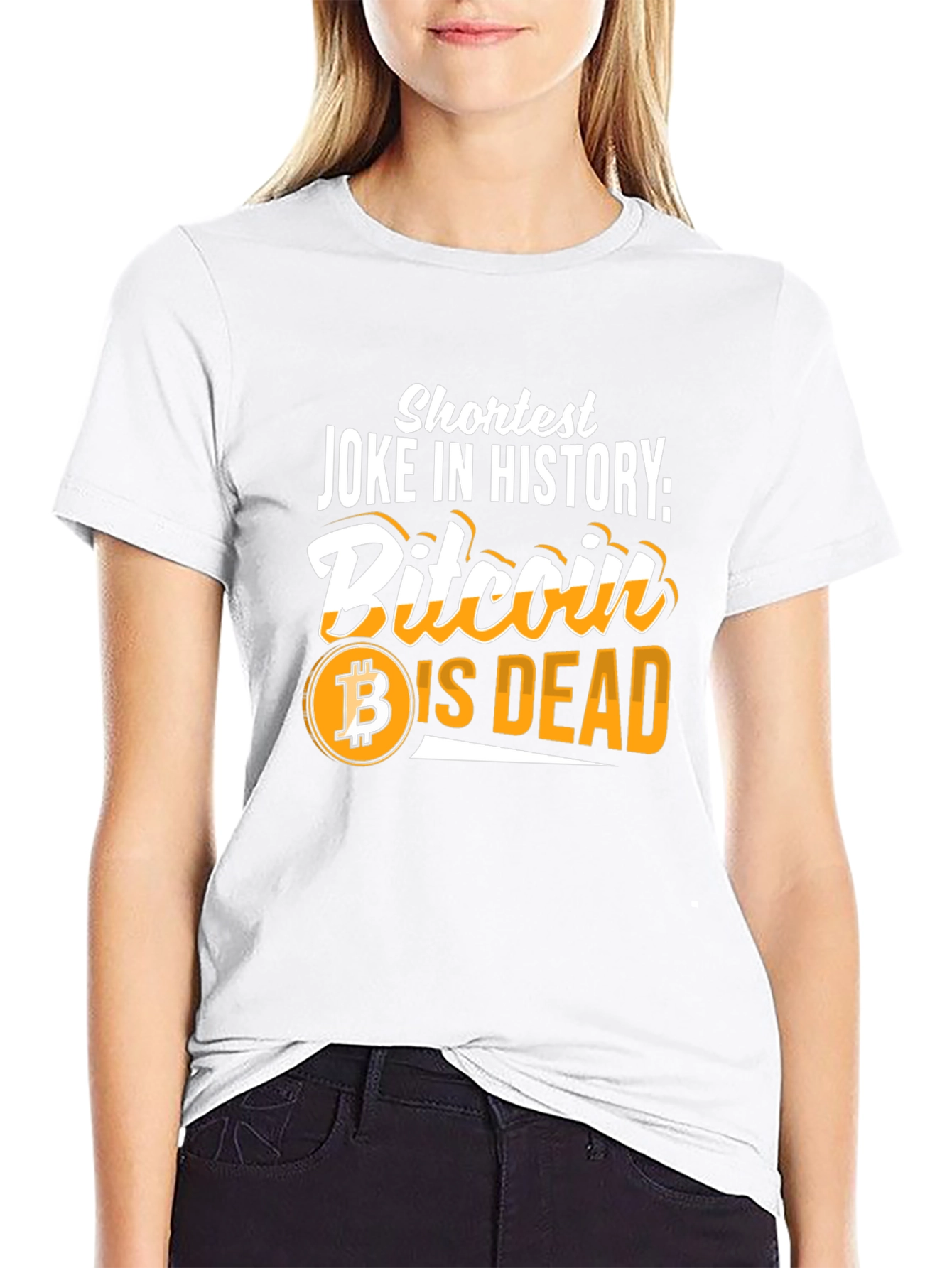 This black T-shirt features a bold and humorous design. The graphic playfully declares, "Shortest Joke in History: Bitcoin IS DEAD." The word "Bitcoin" is emphasized in a vibrant orange color, incorporating the Bitcoin symbol within the design. The shirt is made of what appears to be a soft and comfortable cotton blend, perfect for casual wear. Show off your love for cryptocurrency and make a statement with this unique tee. Ideal for Bitcoin enthusiasts, tech lovers, or anyone with a sense of humor. Wear it to crypto meetups, casual outings, or as a conversation starter. Makes a great gift!