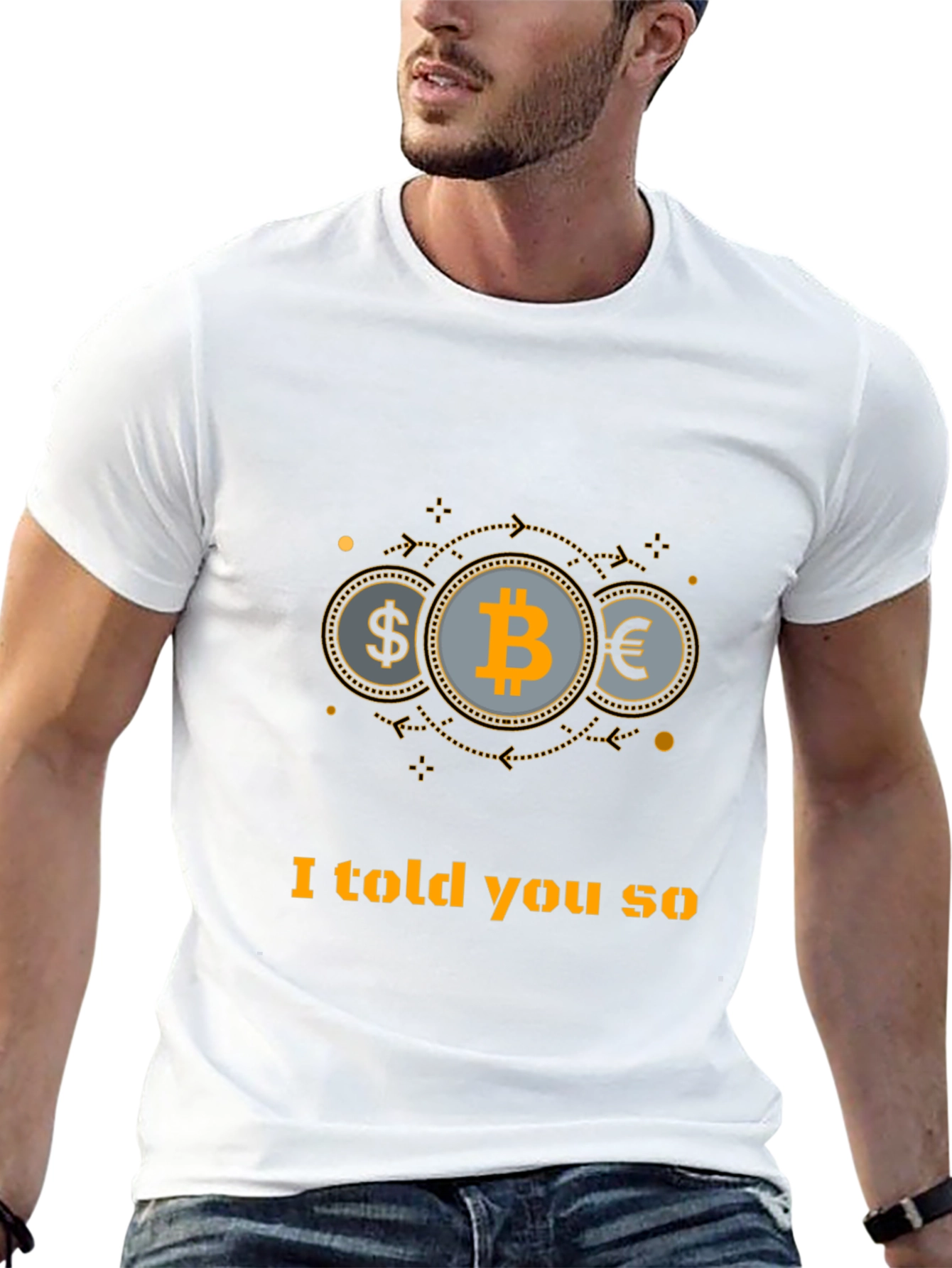 Show off your foresight with this black t-shirt featuring Bitcoin, dollar, and euro icons, linked by stylish circular arrows. The graphic design is complemented by the phrase, "I told you so", perfect for crypto enthusiasts and investors who want to make a statement. Made from comfortable, breathable material, this tee is ideal for casual wear, tech conferences, or sparking conversations about cryptocurrency. A unique and bold addition to any wardrobe, it's the perfect way to express your savvy and confidence in the future of digital currency. Wear it proudly and let your shirt do the talking!