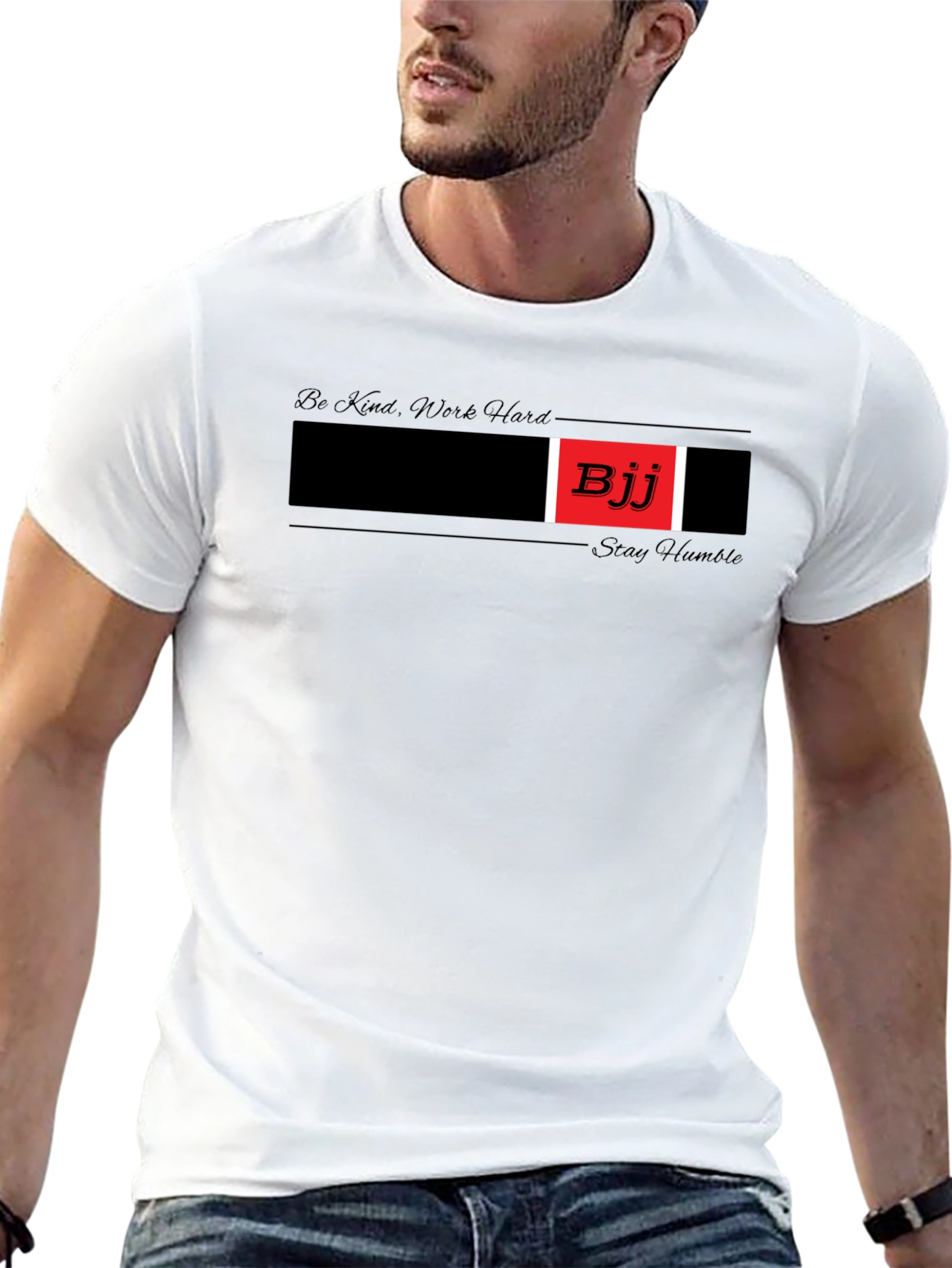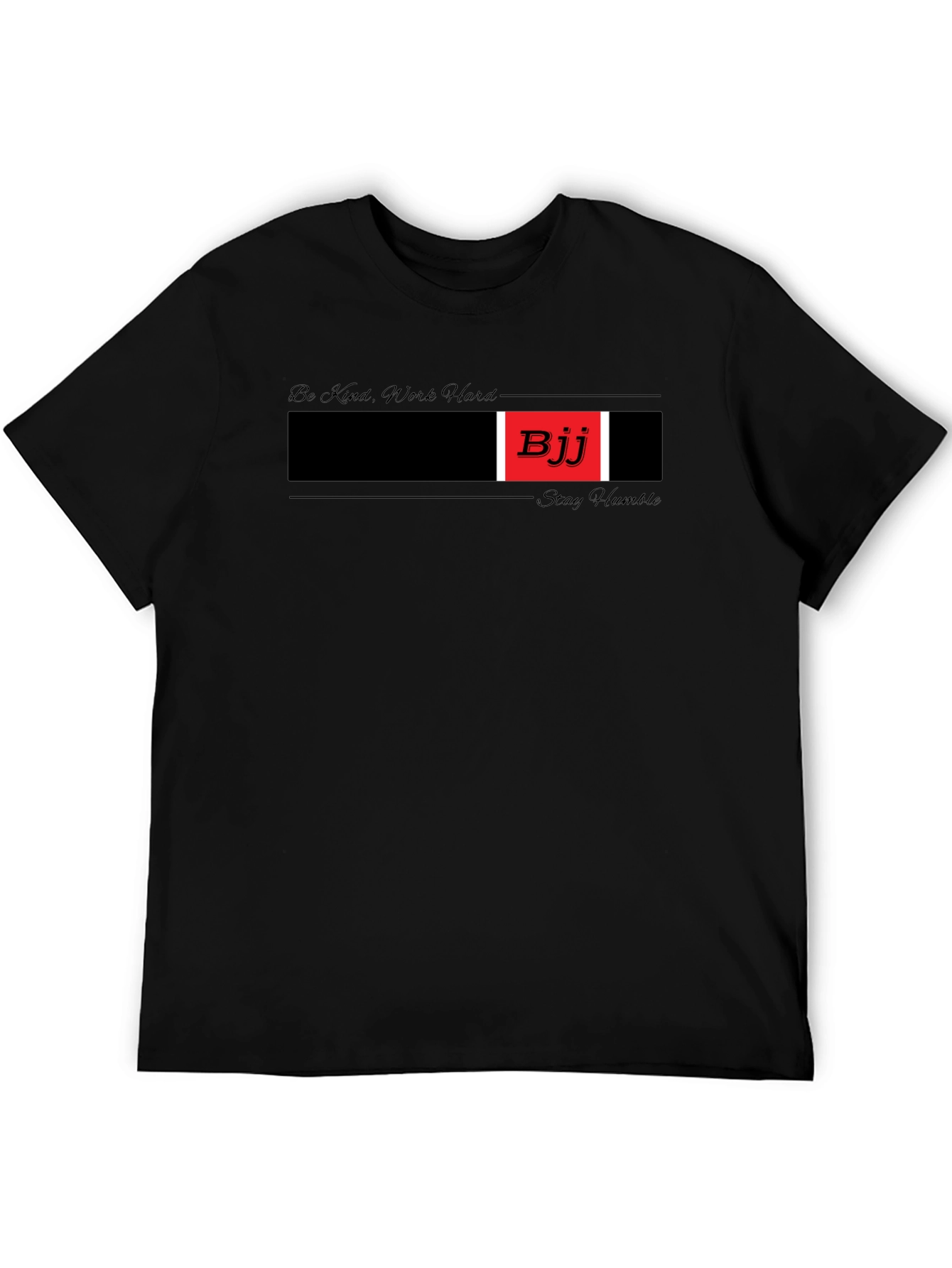This stylish black t-shirt features a bold graphic design for Brazilian Jiu-Jitsu (BJJ) enthusiasts. The central design element includes a black bar accented with a vibrant red square displaying "BJJ" in white lettering. Complementing the design are subtle phrases: "Be Kind, Work Hard" above the graphic and "Stay Humble" below it, adding a touch of inspiration. Made from a comfortable-looking fabric, this tee is perfect for casual wear, training sessions, or showing your passion for BJJ. It's an ideal gift for grapplers who appreciate unique and motivational apparel.