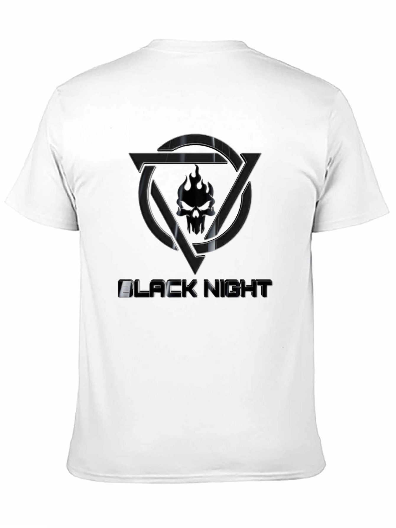 Rock a bold look with this Black Night graphic t-shirt. The design features a metallic-style skull with flames inside a triangular circle, giving it an edgy and eye-catching appeal. The graphic is prominently displayed on the chest of the classic black tee. Made from comfortable materials, this shirt is perfect for casual outings, concerts, or making a statement wherever you go. Show off your unique style and attitude with this must-have addition to your wardrobe. Pair it with jeans or shorts for a complete, standout ensemble.