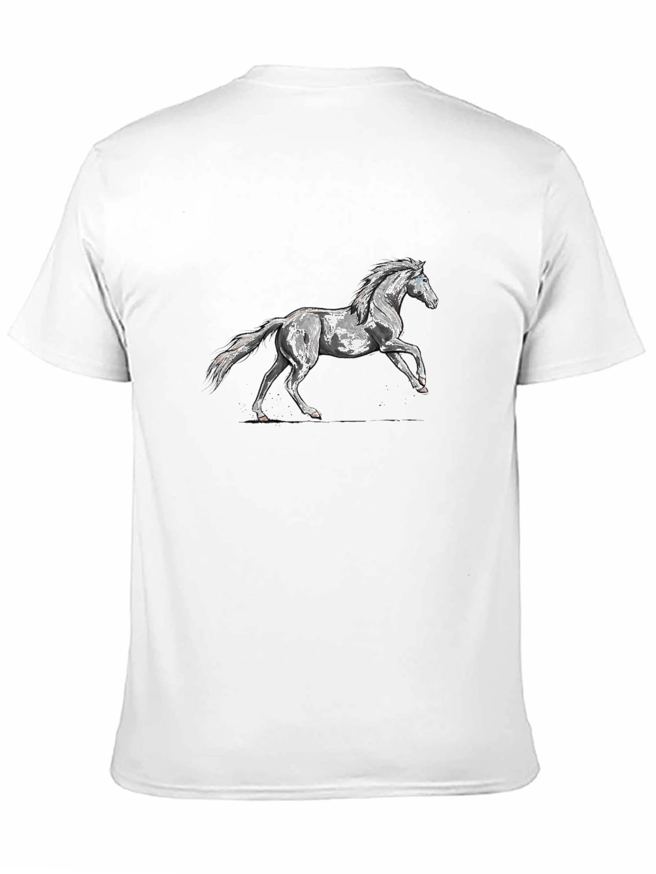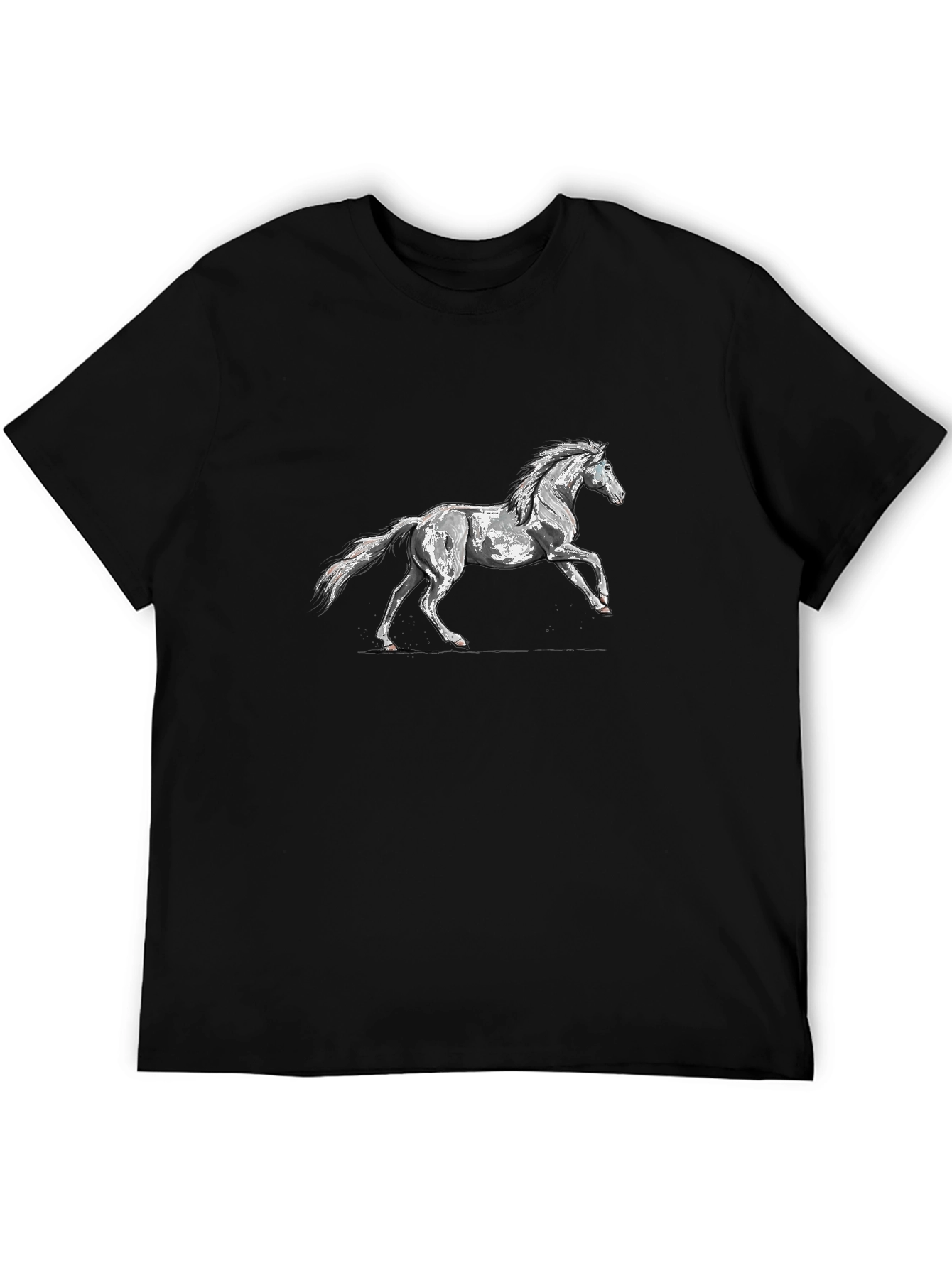 This stylish black t-shirt features a striking graphic of a horse in mid-stride. The design is eye-catching and adds a unique touch to a classic wardrobe staple. Made from what appears to be a soft and comfortable fabric, this tee is perfect for casual wear. The t-shirt has a standard crew neck and short sleeves, making it a versatile choice for everyday outings, weekend adventures, or simply relaxing at home. Show off your love for horses with this standout tee!
