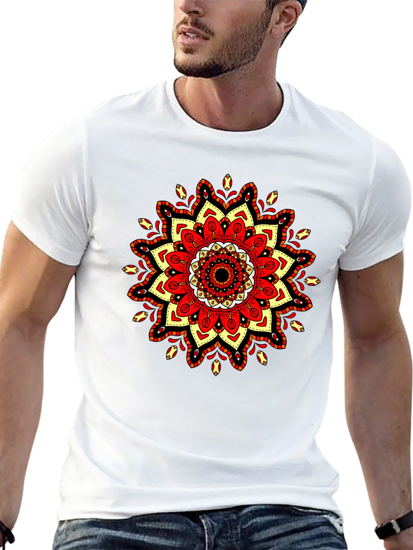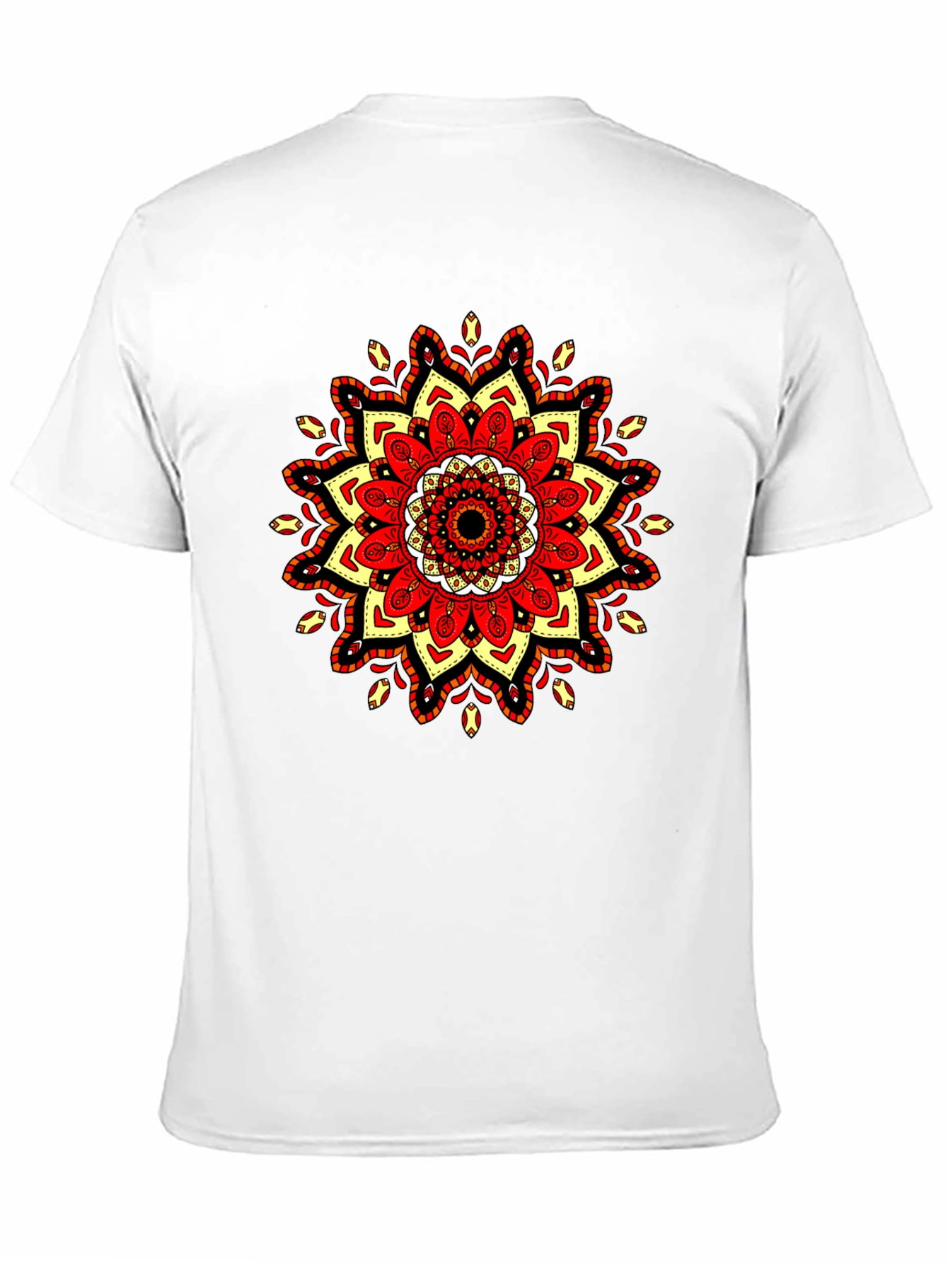 Elevate your casual style with this striking black t-shirt, featuring a vibrant mandala design. The intricate mandala is rendered in bold colors of red, yellow, and white, creating a visually captivating focal point on the shirt's front. Crafted from a comfortable, breathable fabric, this tee is perfect for everyday wear. The classic crew neck and short sleeves offer a relaxed fit, making it ideal for layering or wearing on its own. Add a touch of artistic flair to your wardrobe with this unique and eye-catching t-shirt. Great for casual outings, concerts, or lounging at home.