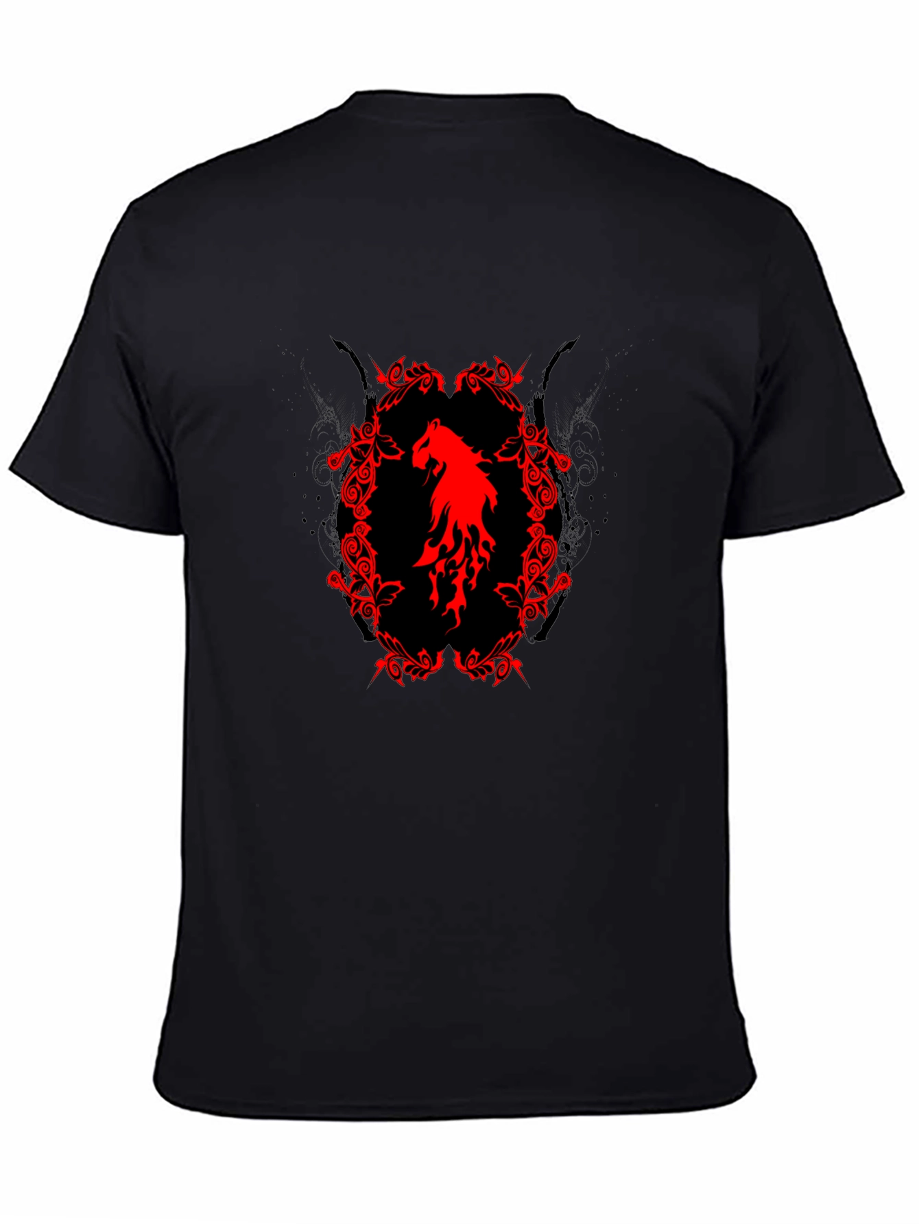 This classic black t-shirt features a striking red graphic of a stylized horse, creating a bold and eye-catching design. The tee is made from what appears to be a soft, comfortable cotton blend, ensuring breathability and all-day comfort. The vibrant red horse graphic is framed within a decorative border, adding a touch of artistry to the overall look. This t-shirt is ideal for casual wear, whether you're heading to a concert, hanging out with friends, or simply running errands. Pair it with jeans or shorts for a relaxed yet stylish ensemble. The unique horse design makes it a great conversation starter and a perfect gift for horse lovers or anyone who appreciates distinctive graphic tees.