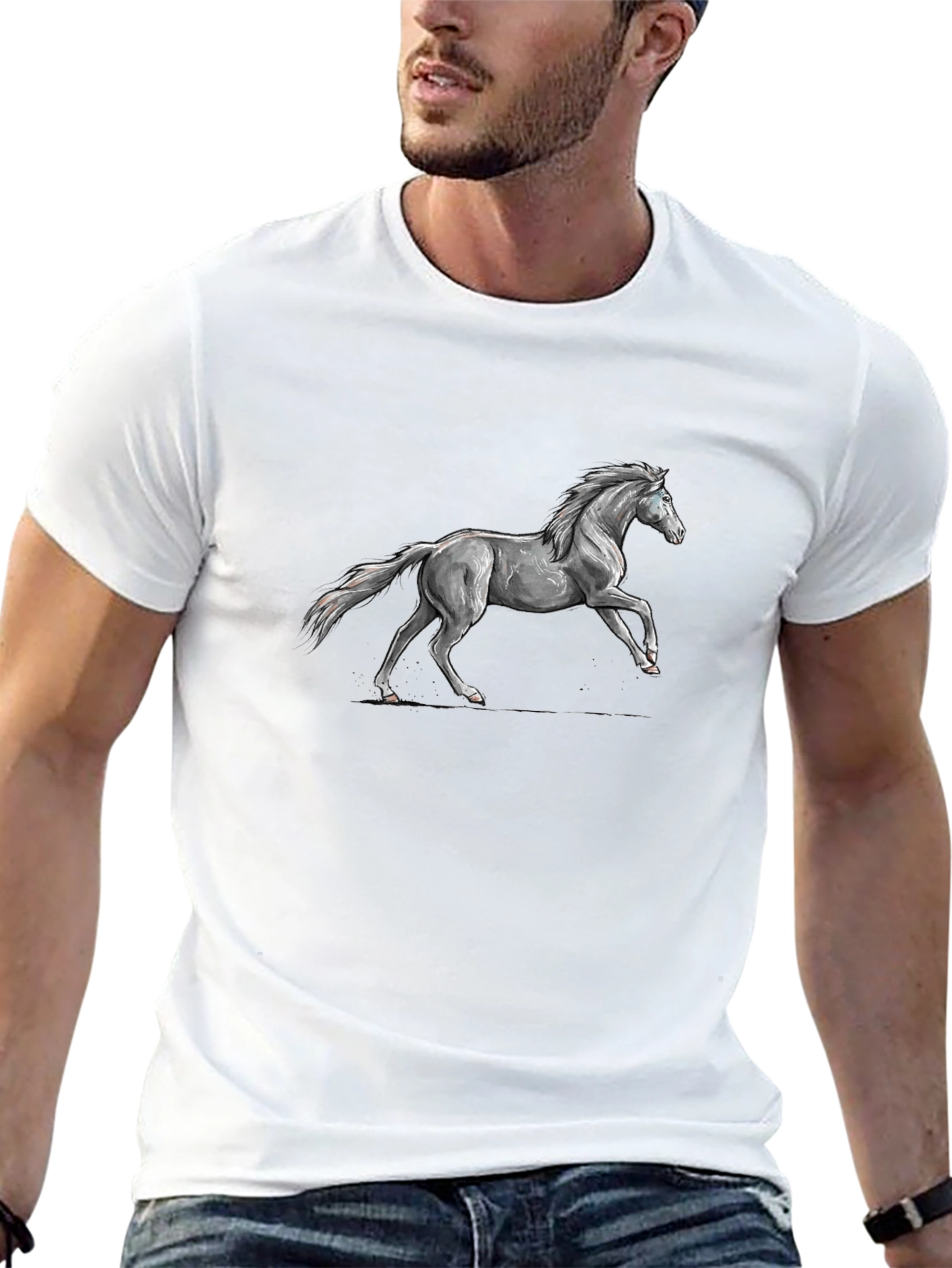Show off your equestrian style with this sleek black t-shirt. Made from a comfortable, breathable fabric, this tee features a striking graphic of a majestic gray horse in mid-gallop. The detailed design adds a touch of sophistication to a casual wardrobe staple. Perfect for horse lovers or anyone who appreciates unique graphic tees, this shirt is ideal for everyday wear, casual outings, or as a standout piece at equestrian events. Pair it with jeans for a relaxed look or dress it up with a blazer for a more polished style.