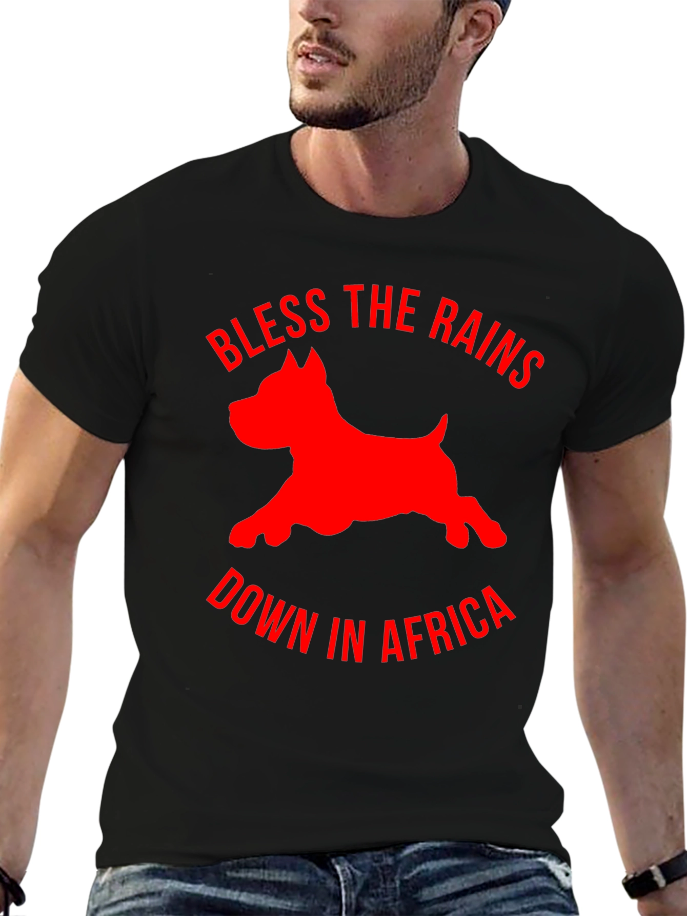 Show your love for dogs and iconic songs with this unique black t-shirt. Featuring a bold red graphic of a playful dog silhouette along with the text "Bless the Rains Down in Africa", this tee is sure to turn heads. Made from comfortable, breathable fabric, it's perfect for everyday wear. Whether you're strolling through the city, relaxing at home, or hanging out with friends, this shirt adds a touch of fun and personality to any outfit. A great gift for dog lovers and music fans alike.