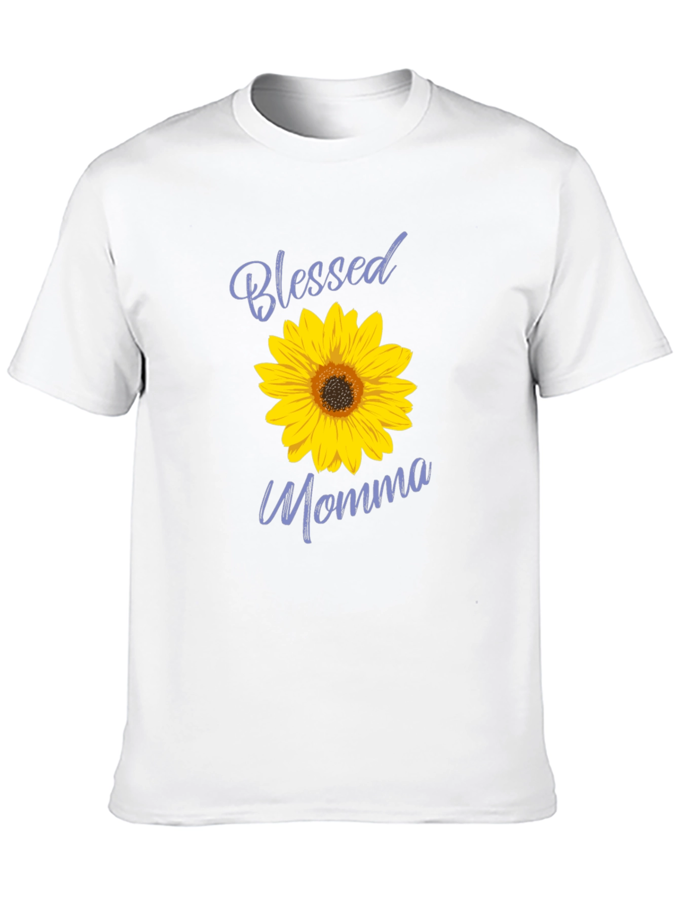 This classic black t-shirt features a vibrant sunflower graphic, accented with the words "Blessed Momma" in a stylish script. The bright yellow petals and detailed center of the sunflower provide a cheerful contrast against the dark fabric. Made from a comfortable-looking material, this tee appears ideal for casual wear, running errands, or relaxing at home. Show your appreciation for motherhood with this stylish and meaningful graphic tee. A perfect gift for mothers who love sunflowers and inspirational messages.