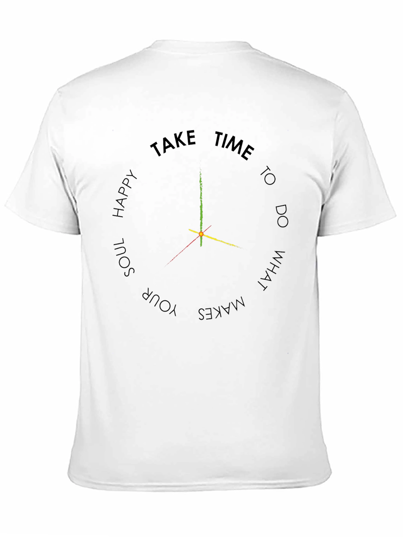 This black t-shirt features a unique design centered around the theme of time and happiness. The circular graphic resembles a clock, with the phrase "Take Time to Do What Makes Your Soul Happy" encircling the dial. The clock hands are represented in vibrant green, red and yellow. Made from a soft-looking fabric, this tee offers both style and comfort. Its casual design makes it perfect for everyday wear, whether you're running errands, meeting friends, or simply relaxing at home. A great reminder to prioritize your well-being and happiness.