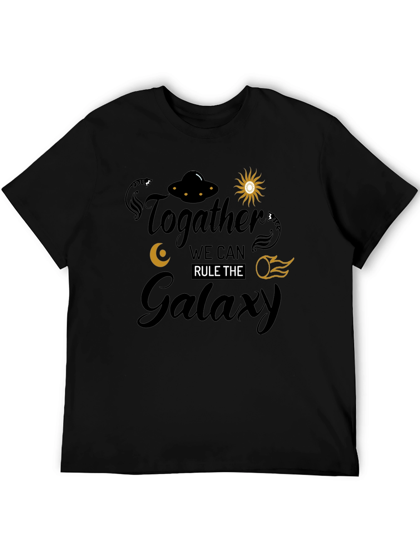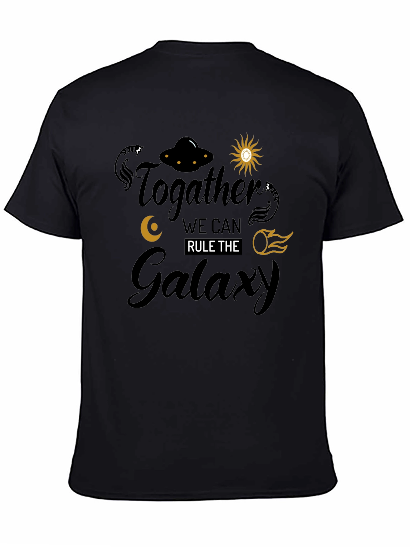 Show off your interstellar style with this eye-catching black t-shirt. The design features the text "Together We Can Rule The Galaxy," playfully arranged with cosmic elements like a UFO, moon, sun, and comet. This shirt is made from a comfortable-looking fabric, suitable for everyday wear, whether you're exploring the city or relaxing at home. The dark color ensures the design pops, making it a great conversation starter and a unique addition to your wardrobe. Perfect for sci-fi fans and those with a cosmic sense of humor!