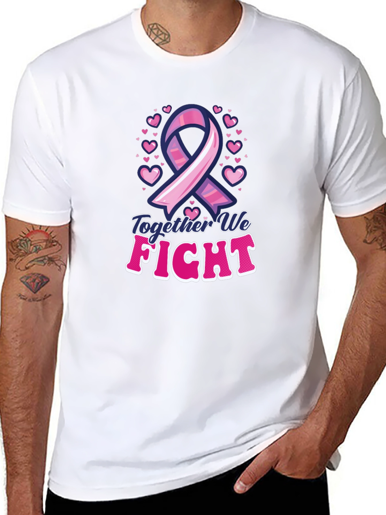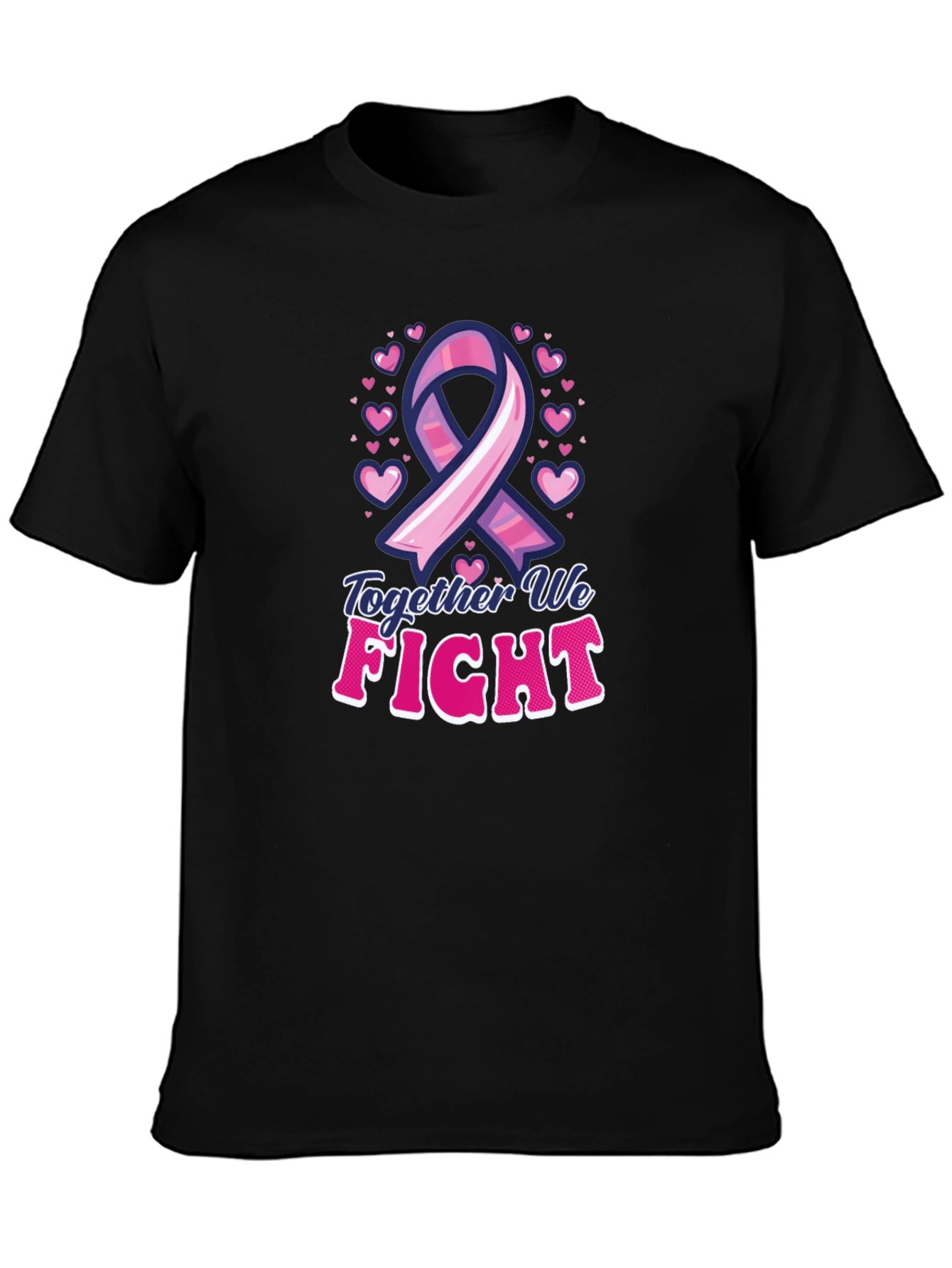 Show your support with this empowering black t-shirt. Featuring a pink ribbon surrounded by hearts and the words "Together We Fight", this tee promotes breast cancer awareness. The design boasts a bold, eye-catching font with a playful outline, adding a touch of charm to this meaningful message. Made from comfortable fabric, it's perfect for walks, events, or simply spreading awareness. Wear it proudly and join the fight against breast cancer.