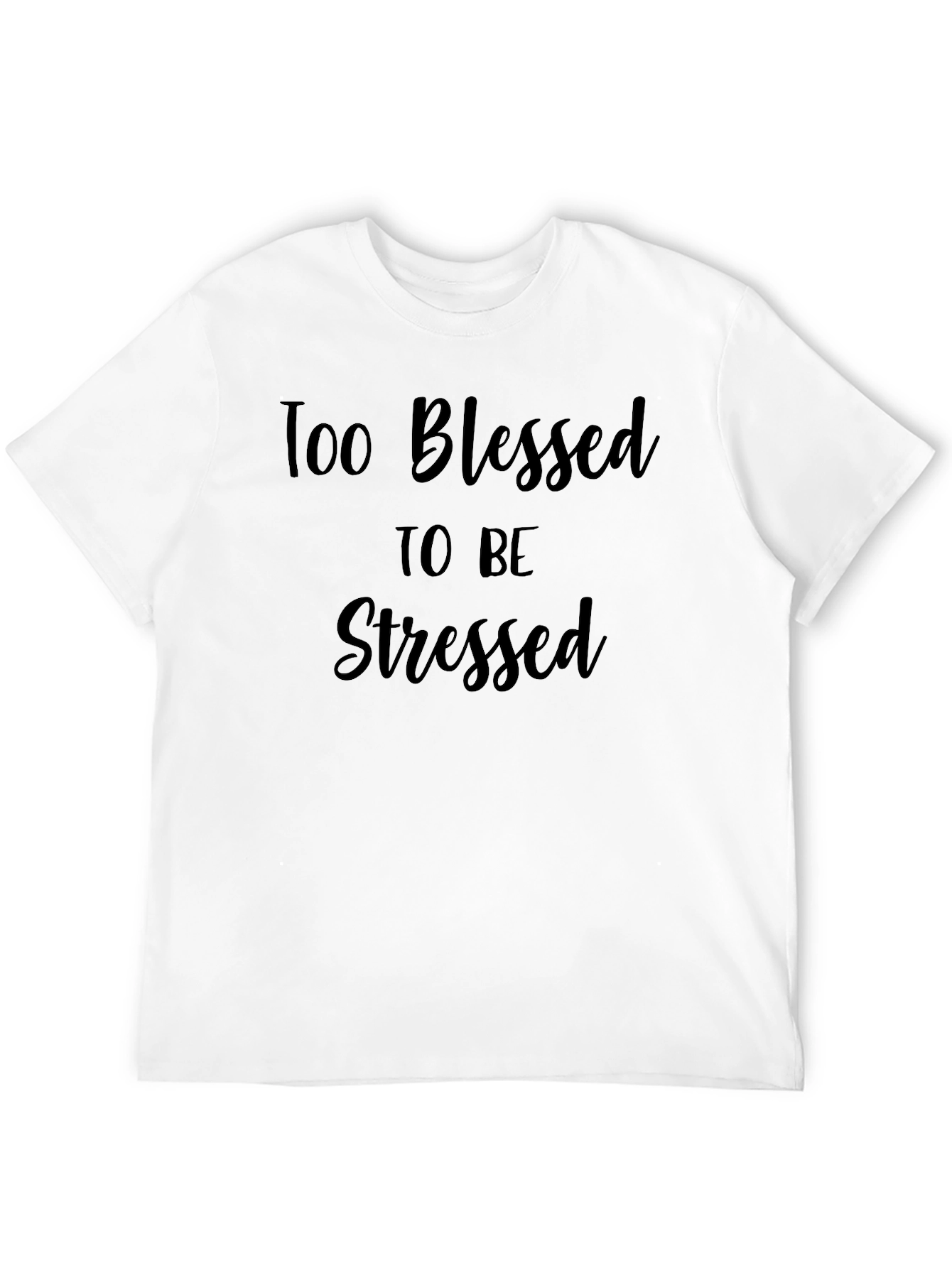 This stylish black t-shirt features the inspirational message "Too Blessed to be Stressed" printed across the chest in an elegant script font. Made from a soft, comfortable material, this tee is perfect for everyday wear. The classic crew neck and short sleeve design offers a relaxed and flattering fit for both men and women. Show off your positive attitude and stay comfortable all day long. This t-shirt is perfect for casual outings, lounging at home, or layering under a jacket. It's a great way to express your gratitude and spread good vibes wherever you go. Add this trendy and motivational piece to your wardrobe today!