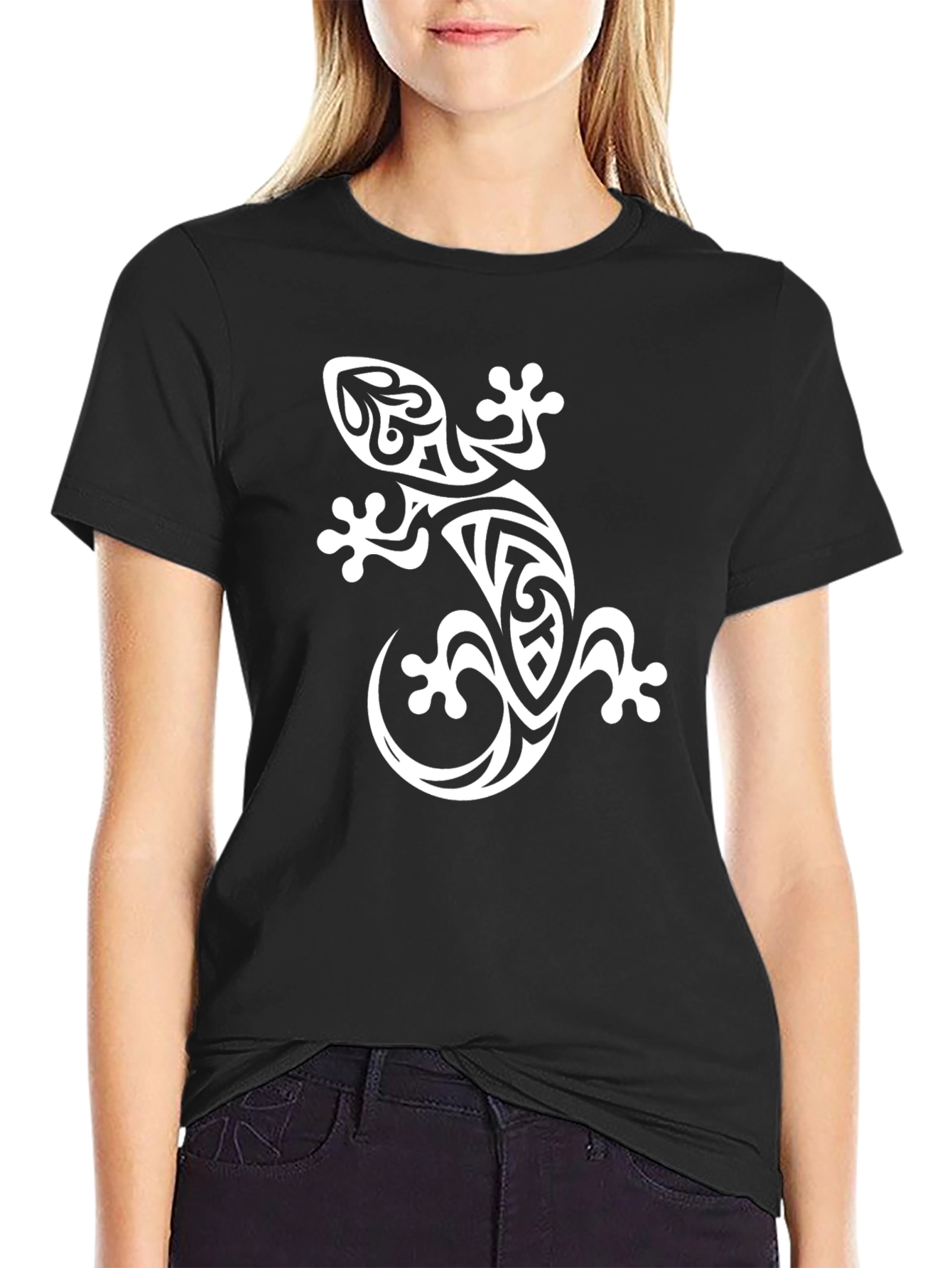 Show off your unique style with this striking black T-shirt. Featuring a bold, white tribal gecko design, this tee is perfect for casual wear. The intricate pattern adds a touch of edginess to a classic wardrobe staple. Made from soft, comfortable fabric, it's ideal for everyday wear or a night out with friends. Pair it with jeans or shorts for a relaxed yet stylish look. Express your individuality with this eye-catching piece that blends comfort and contemporary design. Stand out from the crowd with this unique and versatile T-shirt.