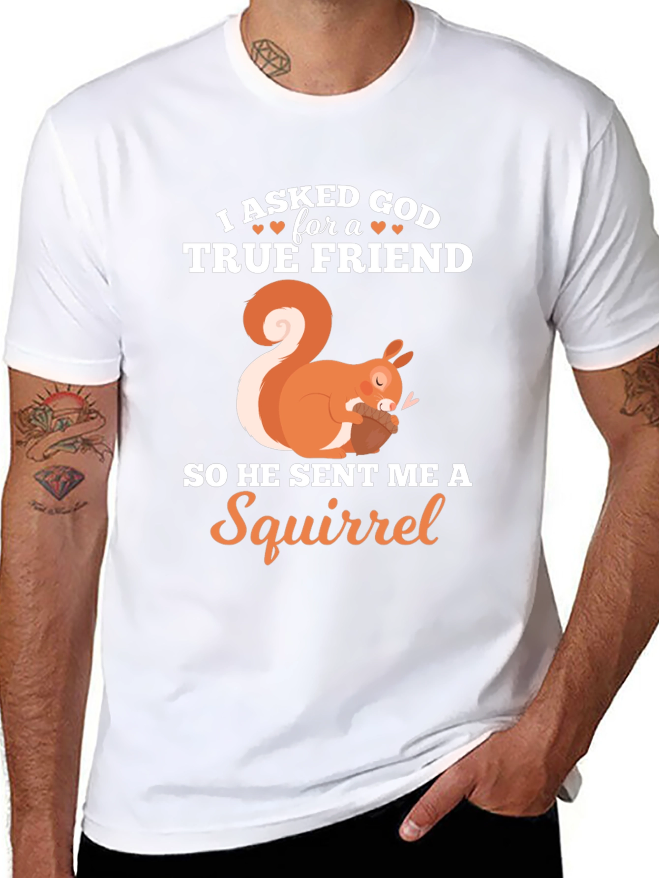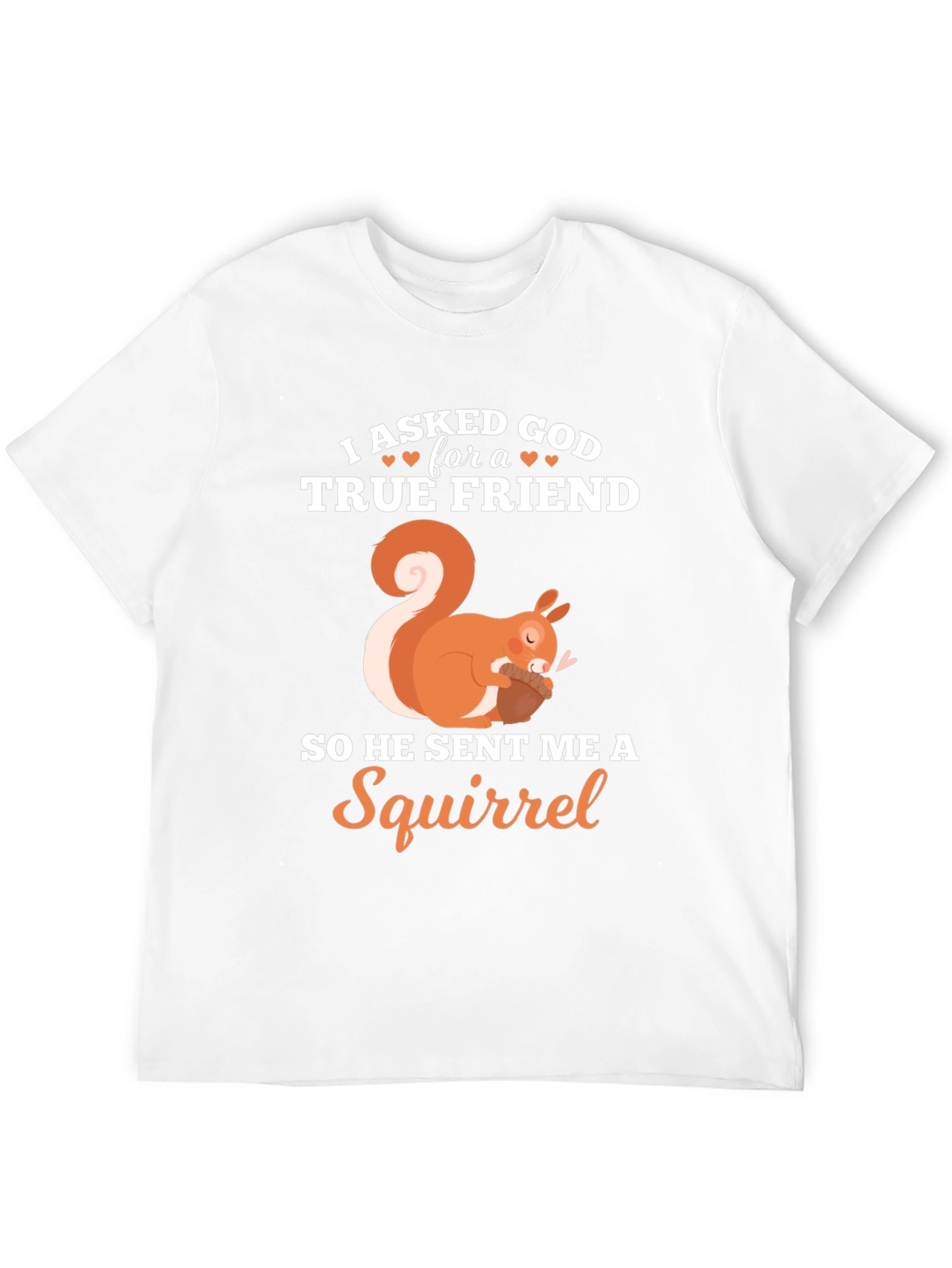 This charming black t-shirt features a playful design perfect for animal lovers. The design includes an adorable orange and white squirrel graphic, accompanied by the heartwarming phrase "I asked God for a TRUE FRIEND, so He sent me a Squirrel" in a mix of white and orange fonts. Ideal for casual wear, this tee offers a comfortable fit and a touch of whimsy to your everyday style. Show off your love for squirrels and your appreciation for friendship with this unique and eye-catching t-shirt. A great conversation starter and a fun addition to any wardrobe.