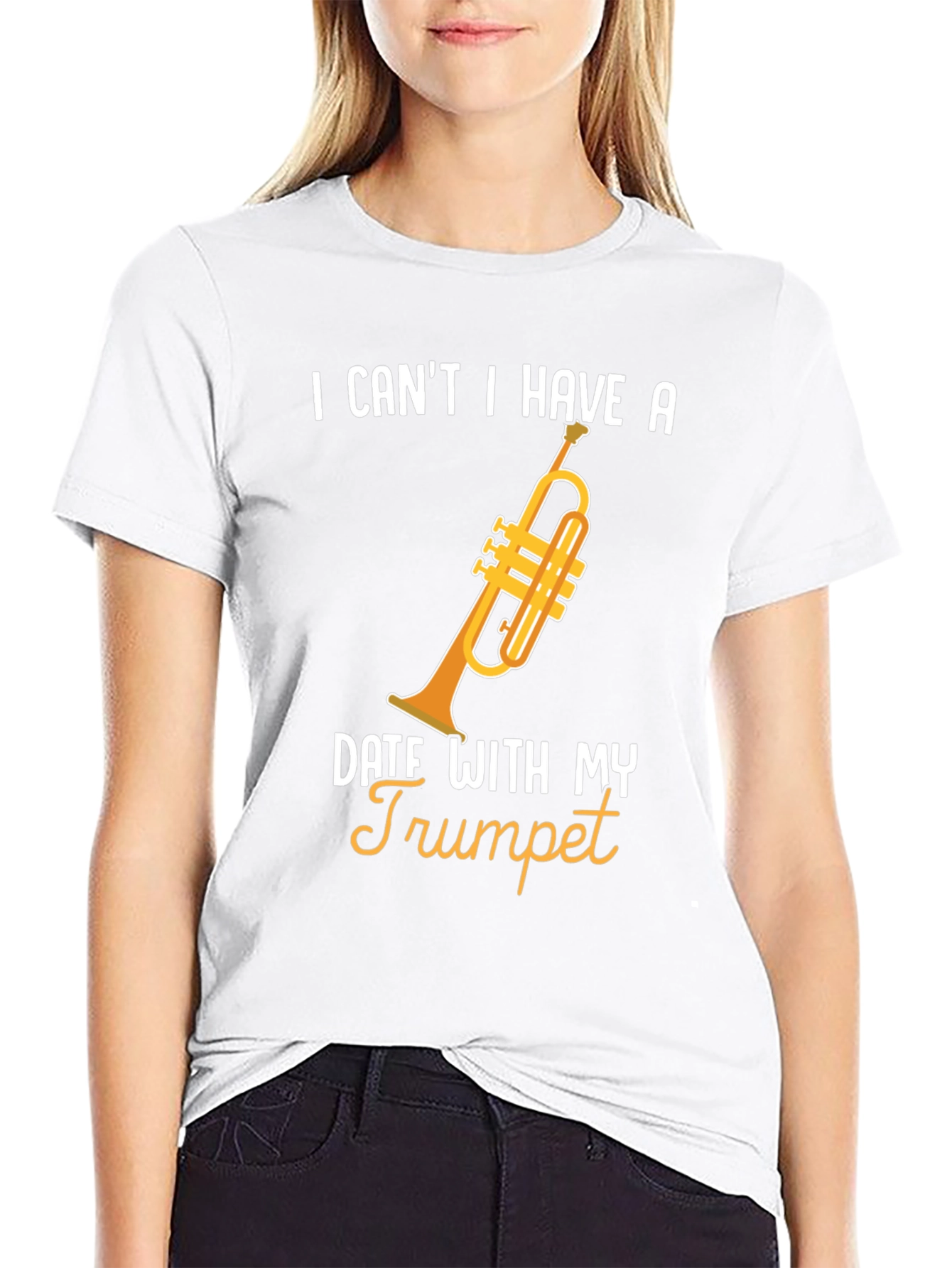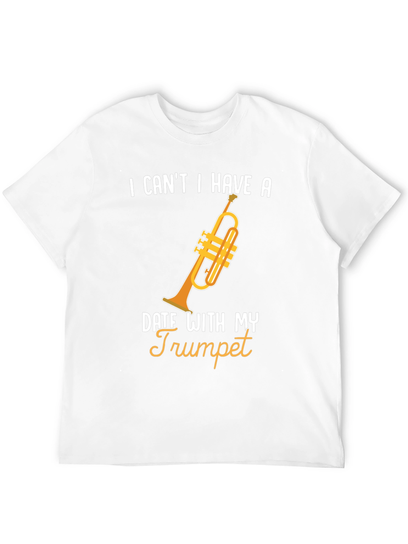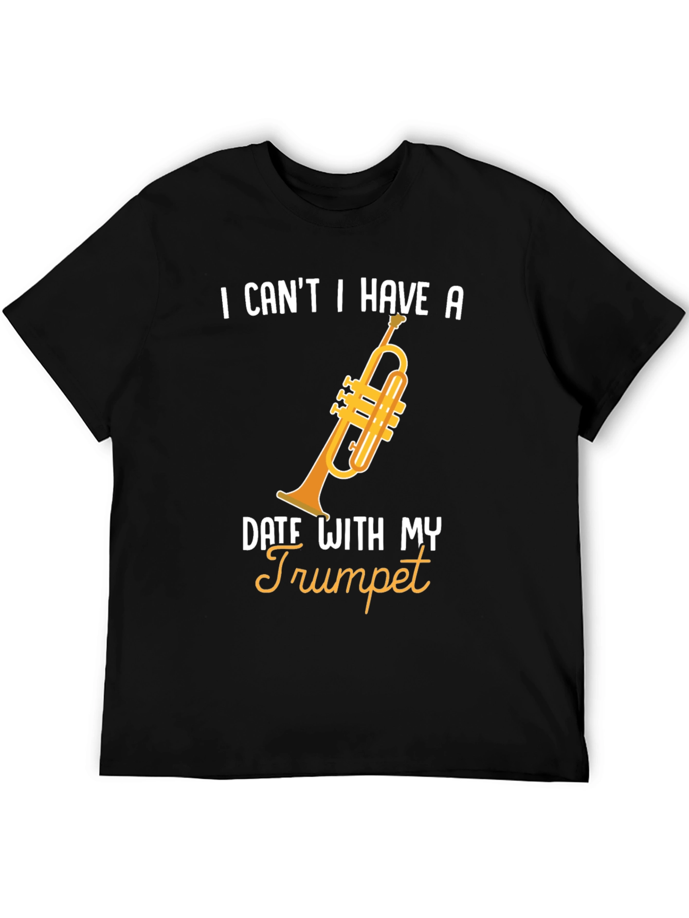 This eye-catching black t-shirt features a fun graphic design that any musician will appreciate. The shirt prominently displays the text "I CAN'T I HAVE A DATE WITH MY Trumpet", making it a humorous statement piece. A cartoon graphic of a gold trumpet is centered between the text lines. Made from what appears to be comfortable cotton fabric, this short-sleeved tee is perfect for casual wear, music events, or as a gift for the trumpet player in your life. Show off your passion for music with this unique and playful t-shirt!