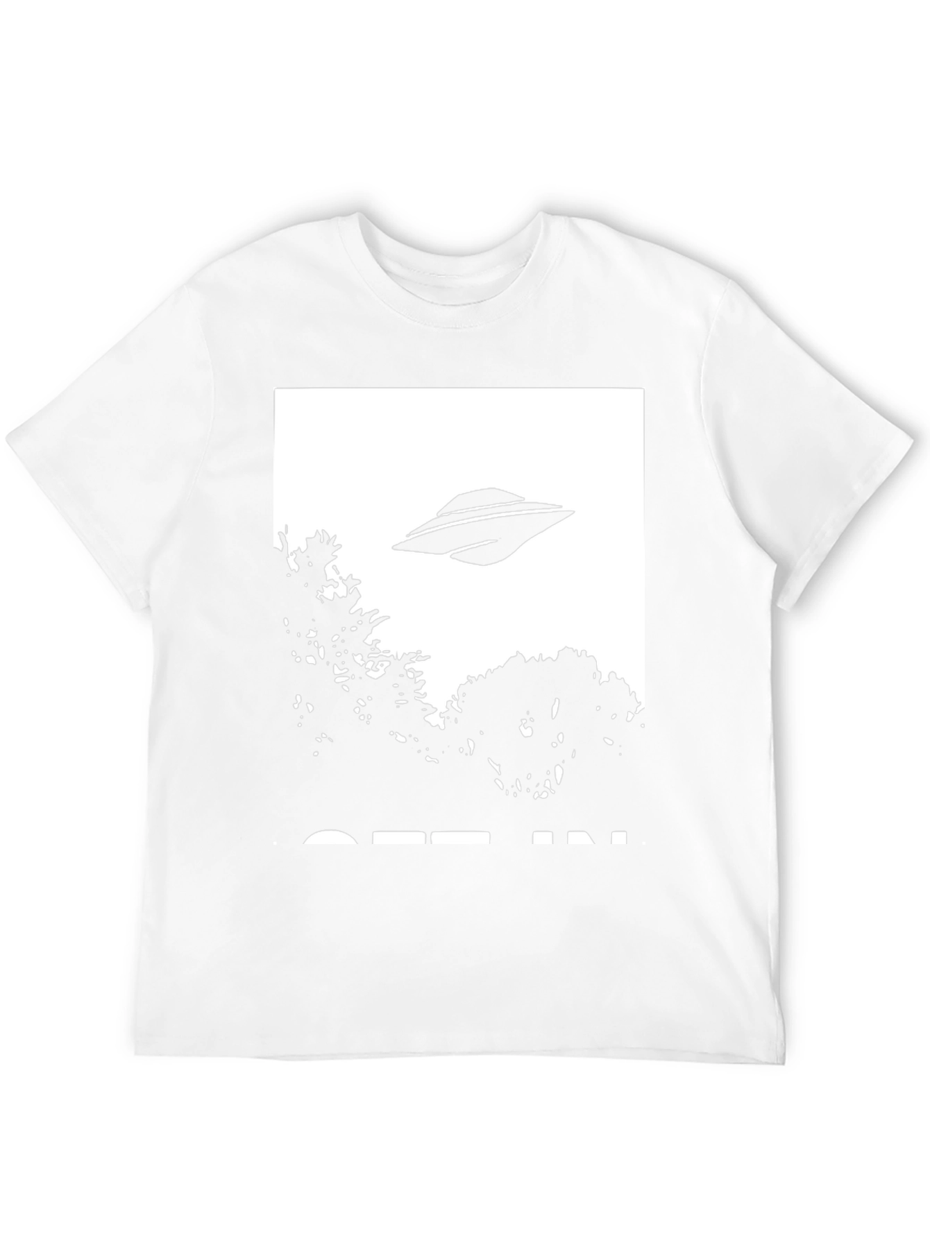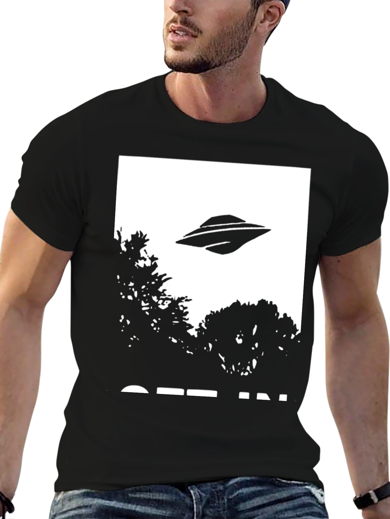 This black cotton t-shirt features a bold graphic print of a UFO hovering over trees, creating a fun and eye-catching design. Made from comfortable, breathable cotton, this tee is perfect for everyday wear. The black color provides a versatile backdrop for the striking white and black graphic. Great for casual outings, lounging at home, or expressing your unique style. Show off your love for all things extraterrestrial with this must-have statement piece. This tee offers both style and comfort for any UFO enthusiast.