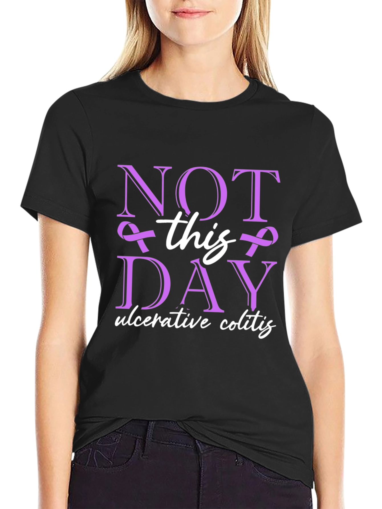 Show your support with this powerful black t-shirt, featuring a striking purple design that reads "NOT THIS DAY" with awareness ribbons incorporated into the text. Below, "ulcerative colitis" is written in a cursive font. This short-sleeved t-shirt is perfect for awareness walks, support meetings, or simply expressing solidarity. Made from a comfortable fabric, it's a meaningful way to start conversations and raise awareness for ulcerative colitis. Wear your support proudly with this impactful t-shirt.