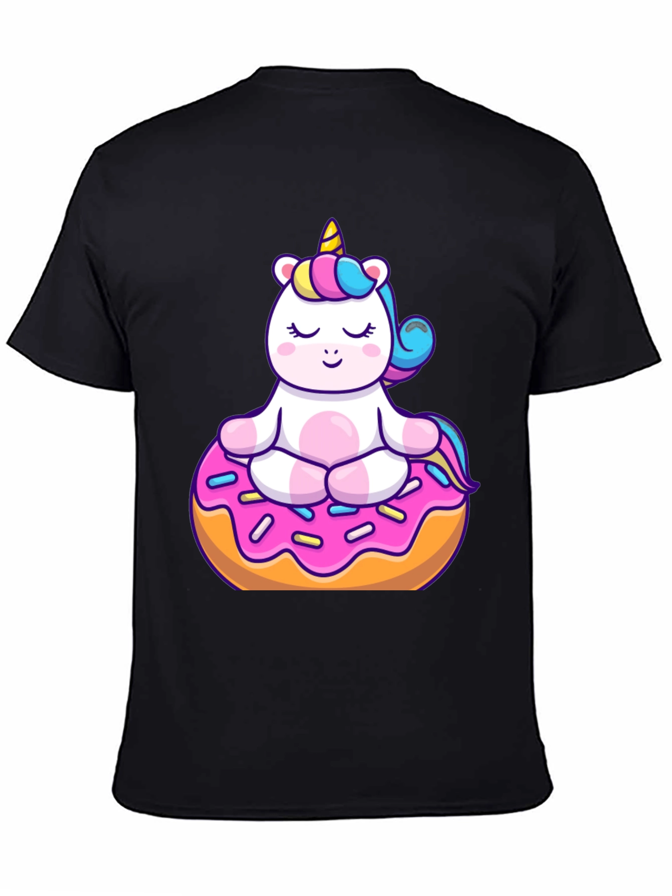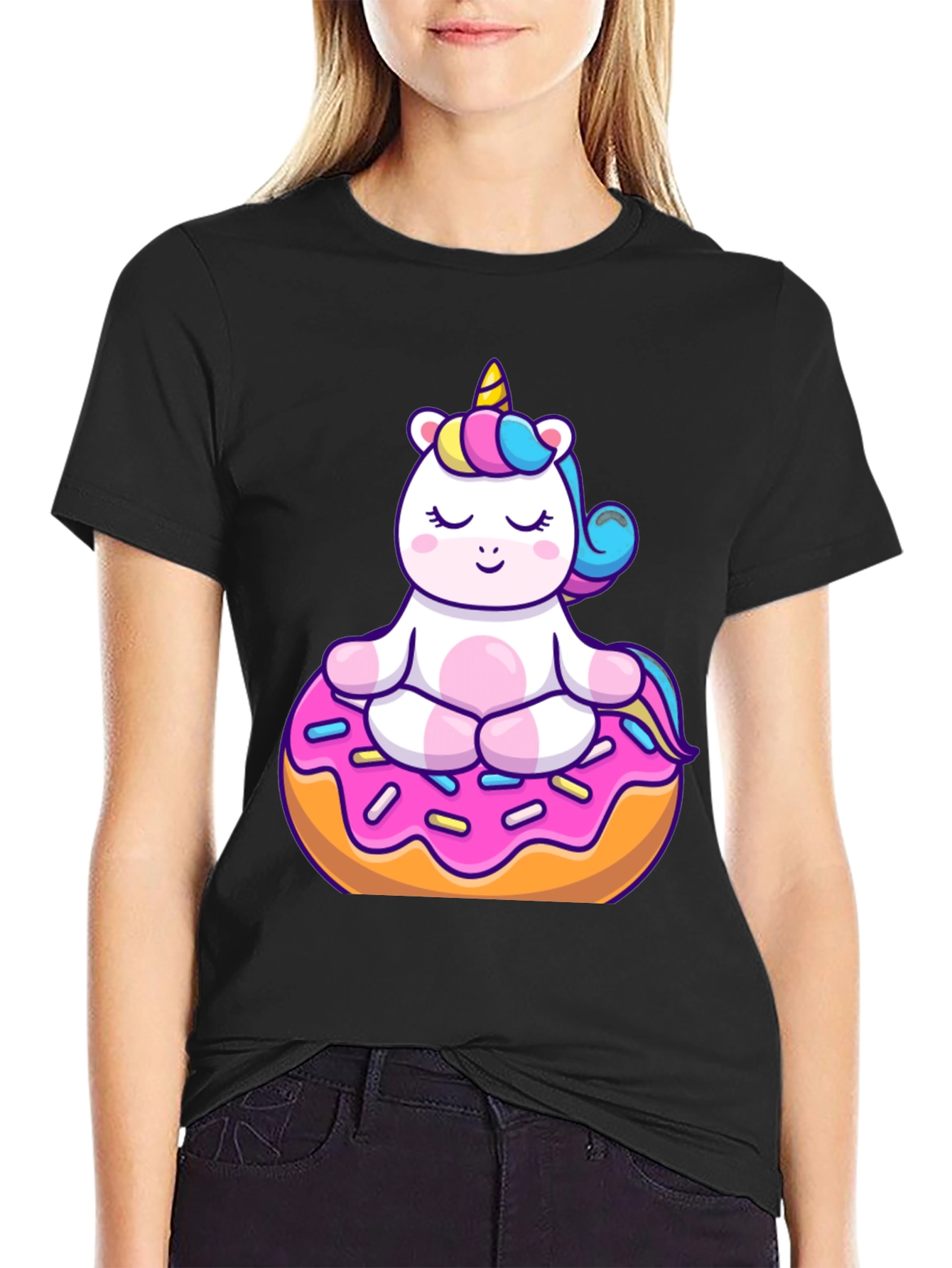 Embrace whimsy with this adorable black t-shirt featuring a cute unicorn meditating on a pink sprinkle donut. The design showcases a colorful unicorn with a yellow horn and a vibrant mane, peacefully perched atop a delicious-looking donut. This playful graphic tee is perfect for unicorn lovers, yoga enthusiasts, or anyone who enjoys a touch of fun in their wardrobe. Made from a comfortable material, this shirt is ideal for casual wear, adding a lighthearted statement to your everyday style. A great conversation starter and a unique addition to any t-shirt collection.