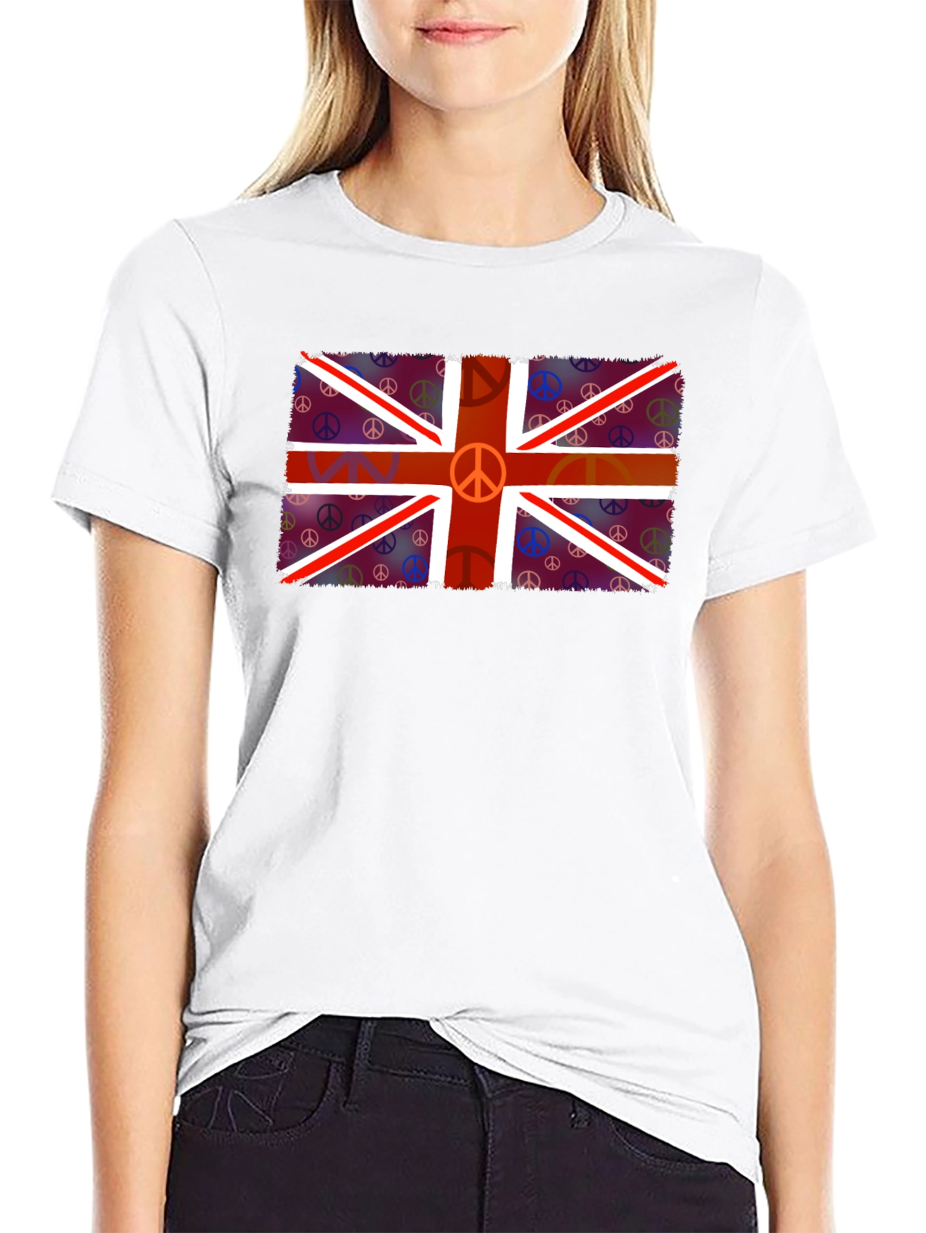 Show off your love for British culture and peace with this unique black t-shirt. The design features a vibrant, stylized Union Jack flag with a retro peace sign at its center. The flag is overlaid on a background with multiple colorful peace signs adding to the cool vintage feel of the t-shirt. Made from a comfortable material, this tee is perfect for casual wear, concerts, or expressing your individual style. Add a touch of classic British flair and positivity to your wardrobe!