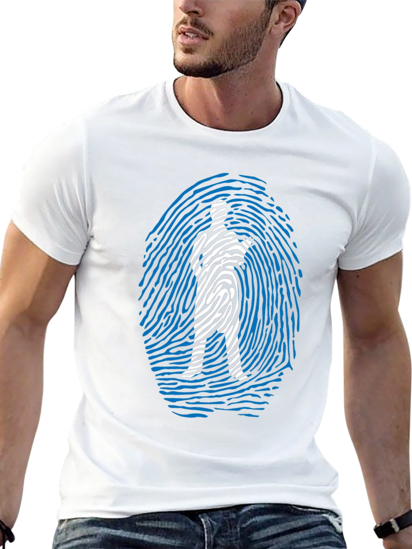 Showcase your individuality with this unique graphic t-shirt. The design features a silhouette figure within a striking blue and white fingerprint pattern, creating a modern and eye-catching visual. Crafted from a comfortable, dark-colored fabric, this short-sleeved tee is perfect for casual wear. Its distinctive design makes it a conversation starter, ideal for expressing your personal style. Dress it up with jeans or down with shorts, this versatile t-shirt is sure to become a favorite in your wardrobe. A must-have for those who love unique and creative apparel.