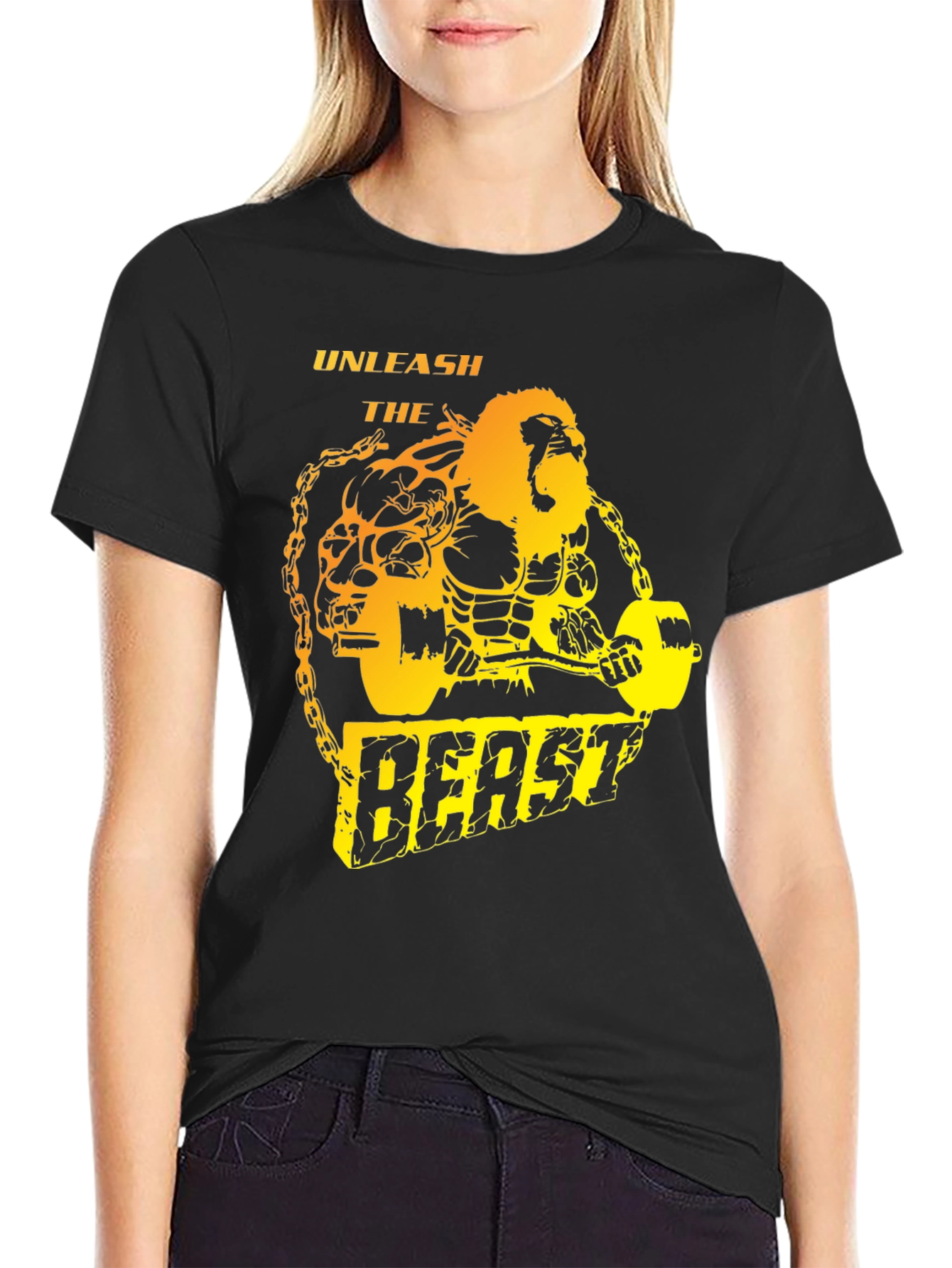 Show off your inner strength with this bold "Unleash the Beast" graphic t-shirt. The shirt features a striking design of a muscular, lion-headed figure lifting weights, surrounded by chains. The design utilizes a vibrant yellow and orange gradient that pops against the black background of the shirt, making a powerful statement. Made from what appears to be comfortable, breathable fabric, this tee is perfect for gym sessions, workouts, or casual wear for those who want to express their dedication to fitness and strength. The classic fit ensures easy movement and a stylish look. Unleash your inner beast with this unique and inspiring t-shirt.