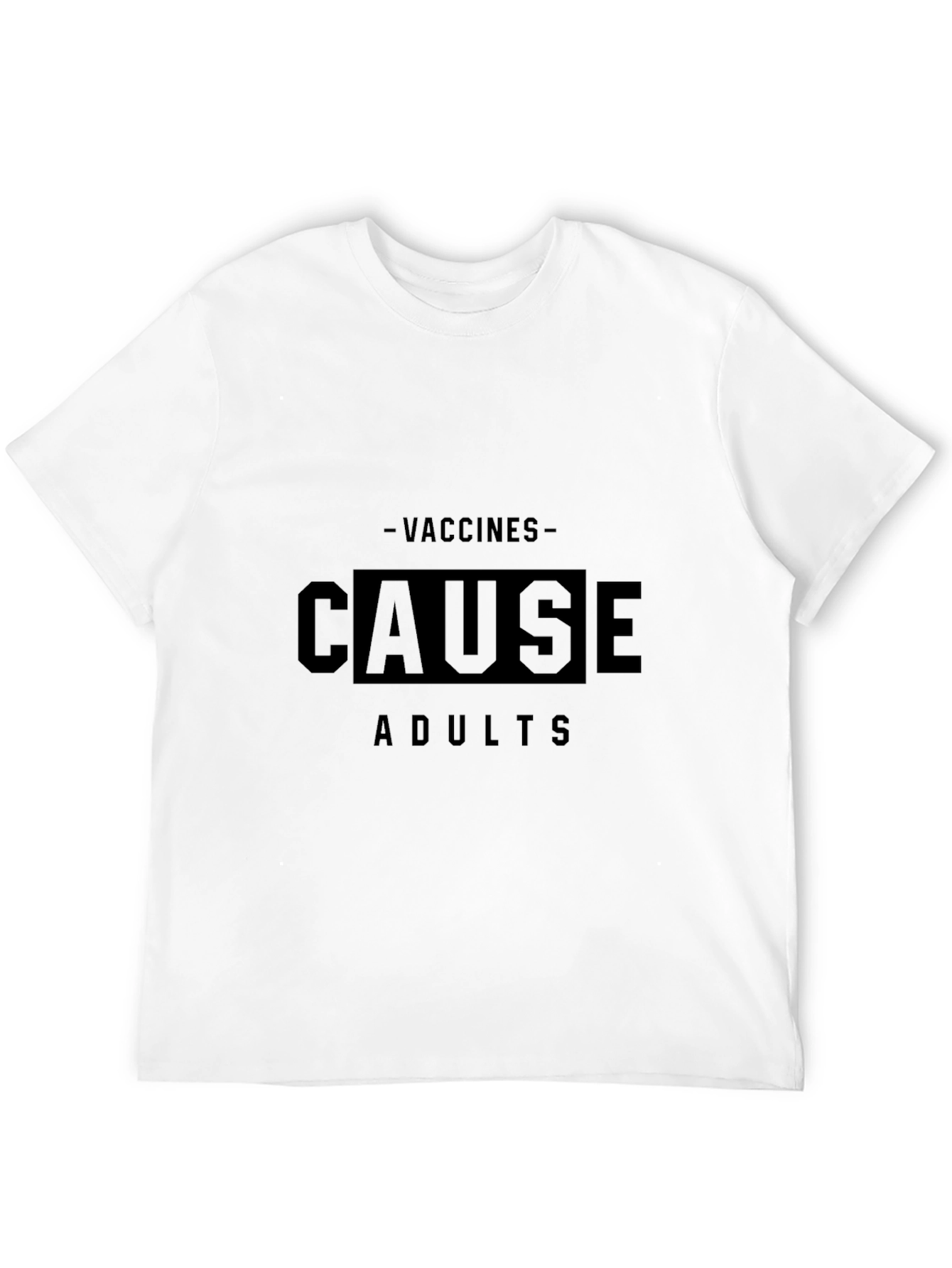 Show off your sense of humor with this eye-catching black t-shirt! The bold design features the statement "-VACCINES- CAUSE ADULTS," a playful and sarcastic take that's sure to spark conversations. Made from what appears to be a soft and comfortable fabric, this tee is perfect for everyday wear. Its classic fit and short sleeves make it versatile for various occasions, from casual outings to social gatherings. Whether you're making a statement or just love a good joke, this t-shirt is a must-have addition to your wardrobe. Get yours today and let your tee do the talking!