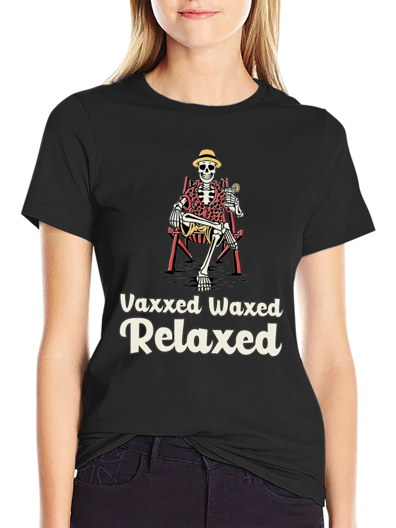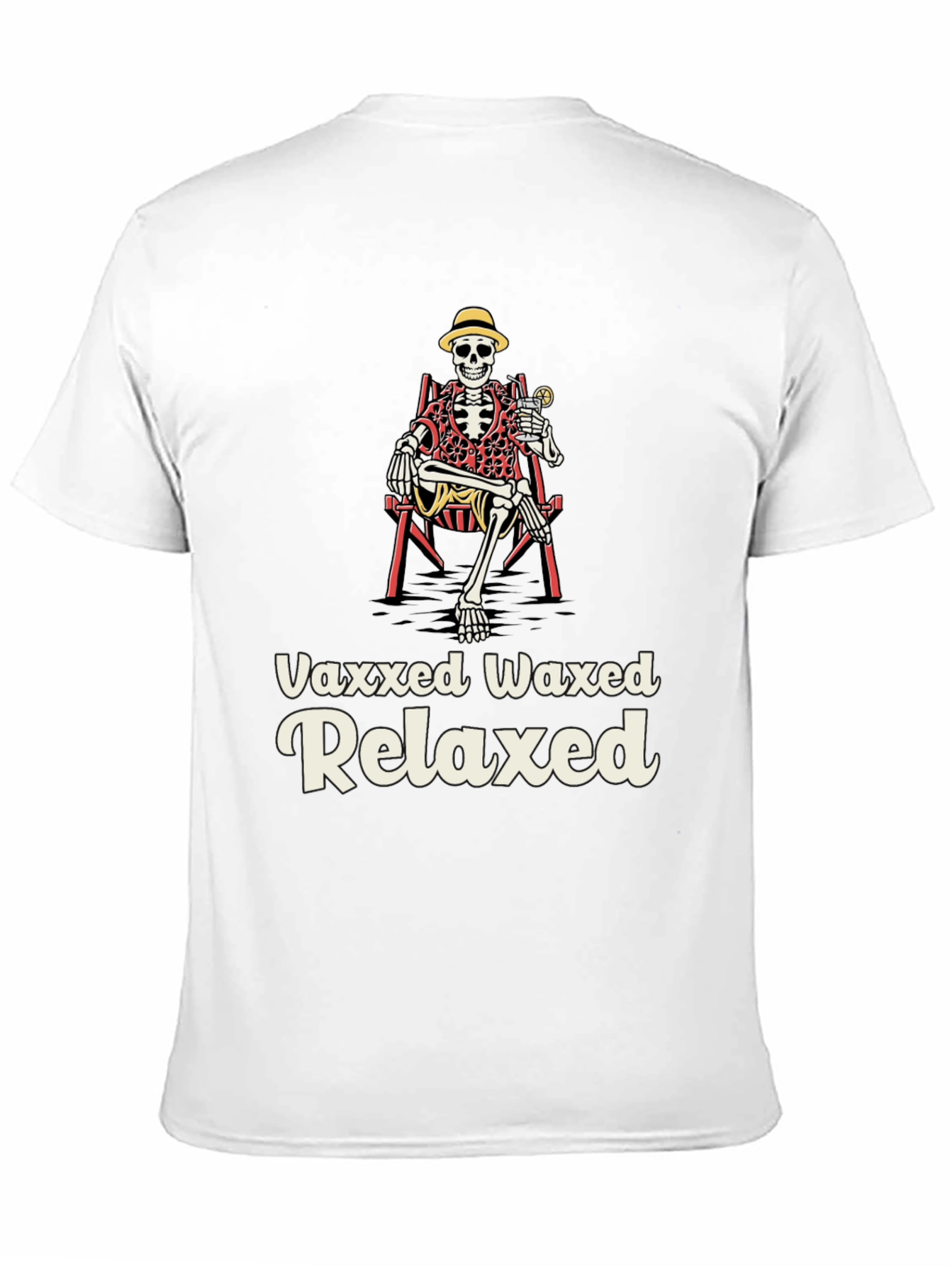 Get ready to chill in style with this unique 'Vaxxed Waxed Relaxed' T-shirt! Featuring a fun skeleton graphic enjoying vacation in a chair with a drink, this tee is perfect for those who love humor with a touch of relaxation. The design is printed on a comfortable black fabric, ideal for casual wear or vacations. Make a statement and spread some laughs with this must-have shirt!