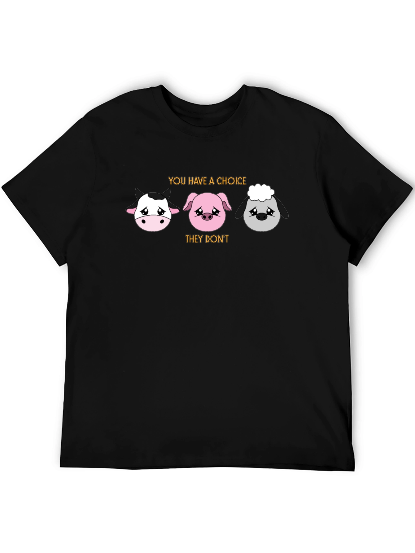 Show your support for animal rights with this eye-catching black T-shirt. The shirt features a poignant design with a cow, pig, and sheep, each drawn in a cute, cartoon style, along with the message "You Have A Choice, They Don't.". This striking image conveys a powerful message promoting veganism and compassion towards animals. Made from what appears to be a comfortable, breathable fabric, this tee is ideal for everyday wear, rallies, or spreading awareness. Wear your values proudly with this unique and meaningful T-shirt.
