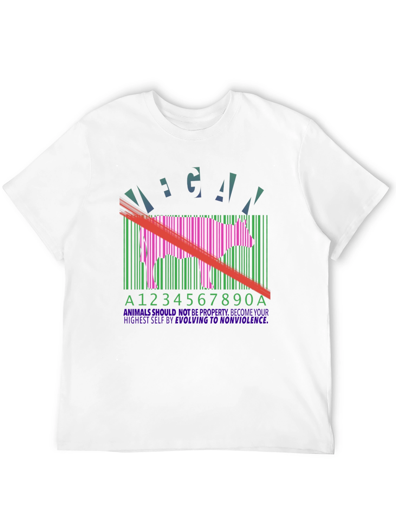 Show your support for animal rights with this unique black t-shirt. The shirt features a pink cow graphic depicted as a barcode, crossed out with a bold red line, symbolizing the concept that animals should not be treated as property. Above the barcode, the word "VEGAN" is stylishly displayed. Below, the statement continues with a powerful message. Made from comfortable material, this tee is perfect for everyday wear or vegan events, making a statement while promoting compassion.