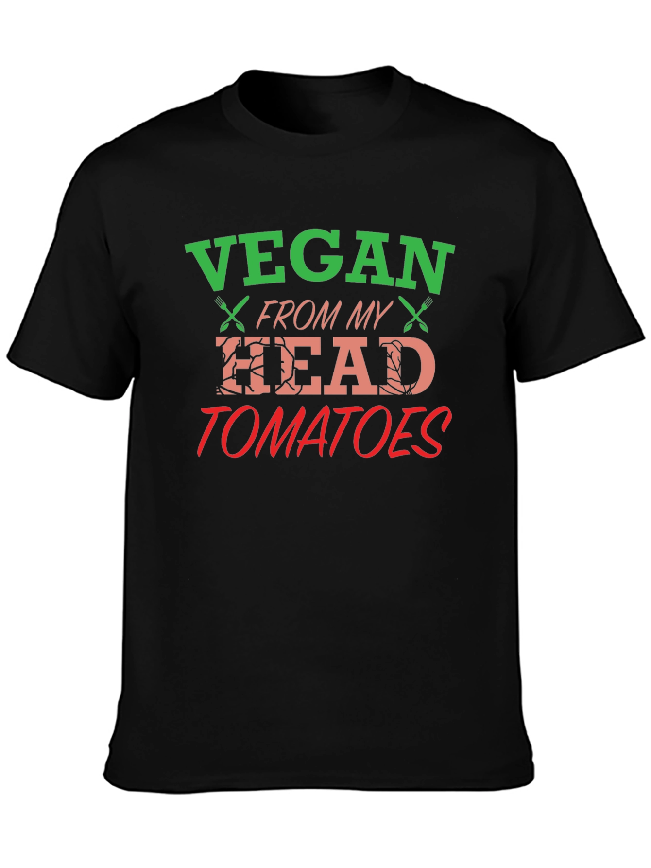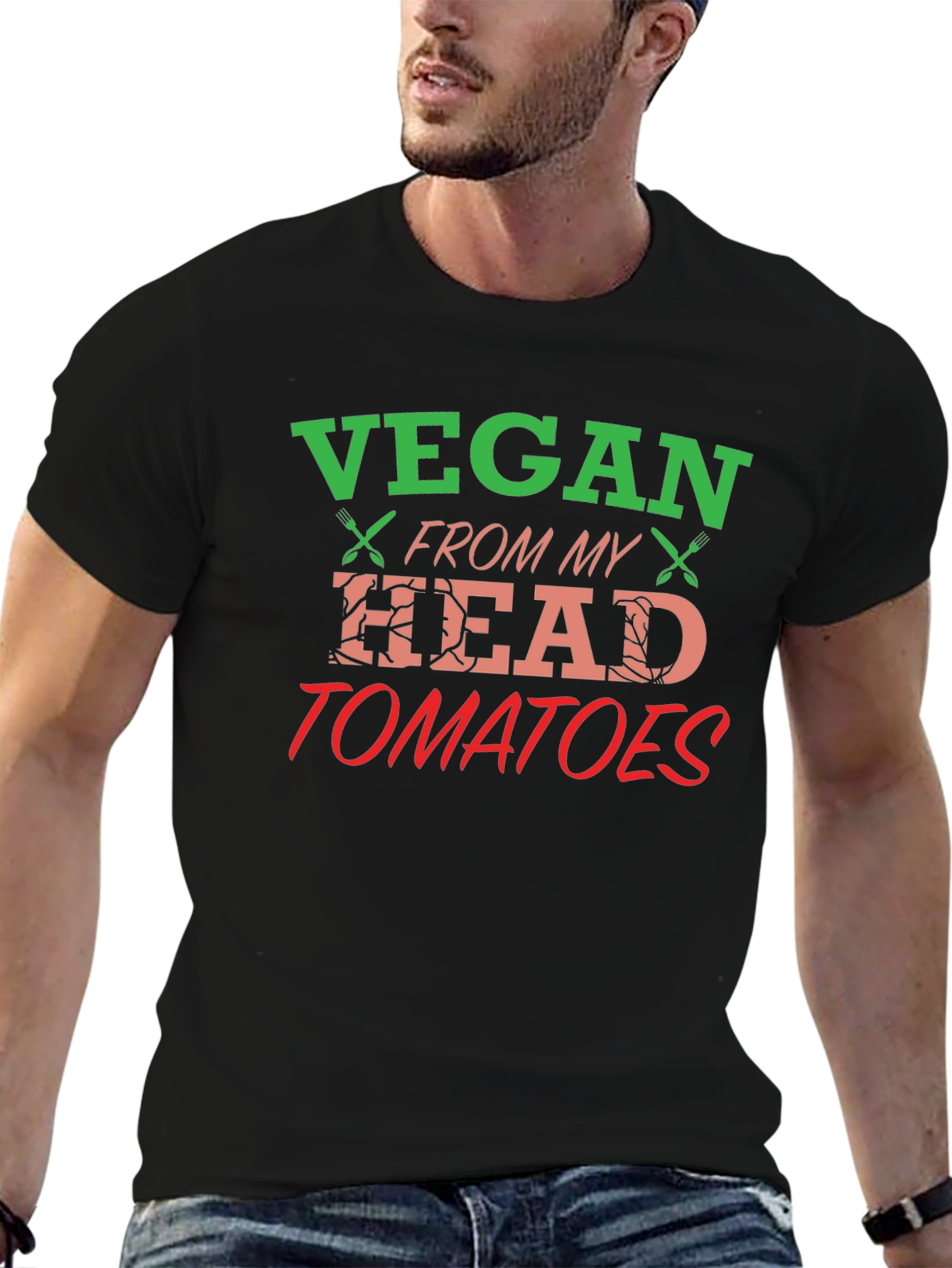 Show your love for a plant-based lifestyle with this unique graphic t-shirt. The design features the playful text "Vegan From My Head Tomatoes" in vibrant green and red lettering. Two forks accent the top text. Crafted from comfortable, breathable fabric, this black tee offers a relaxed fit perfect for everyday wear. Whether you're hitting the farmers market, grabbing coffee, or simply lounging, this shirt is a stylish way to share your values and spark conversations. A fun and quirky addition to any vegan's wardrobe.