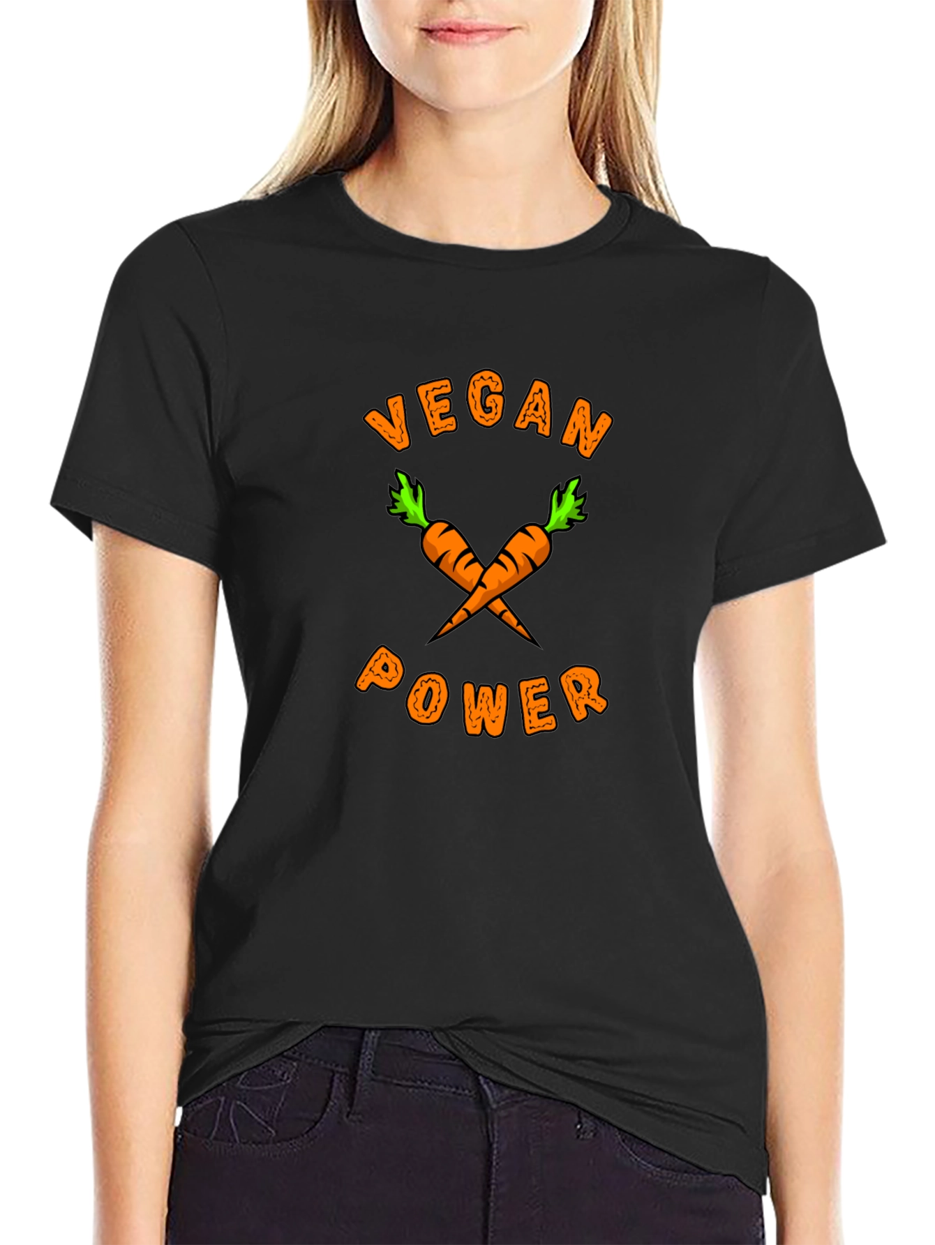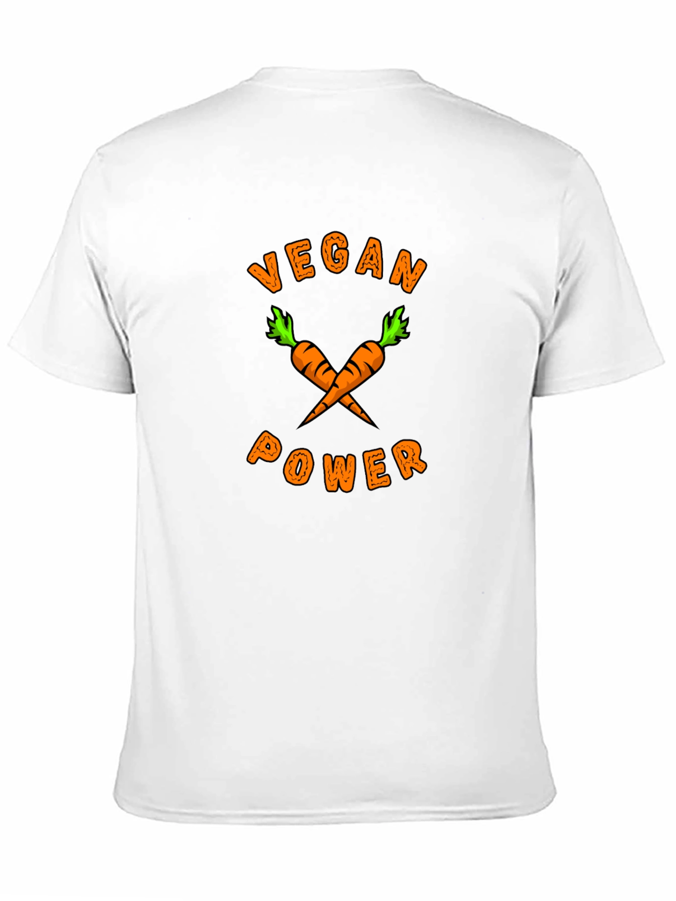 Show off your love for veganism with this eye-catching graphic tee. The black t-shirt features the words "VEGAN POWER" in a playful orange font, accompanied by a crossed carrot design. This t-shirt is made of comfortable material, suitable for everyday wear. Ideal for expressing your vegan lifestyle, this shirt is perfect for casual outings, vegan festivals, or spreading awareness.