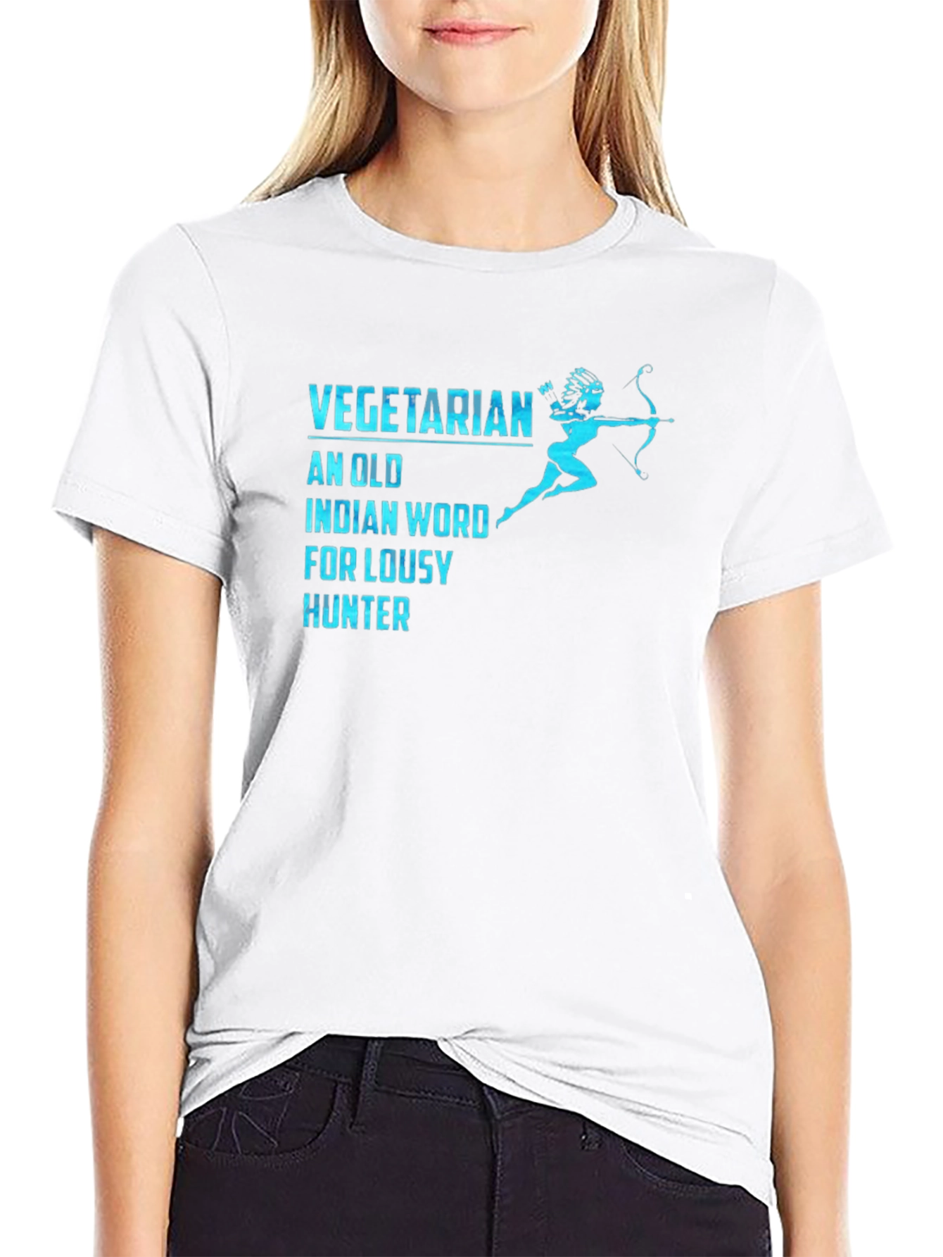 Embrace humor with this eye-catching black t-shirt featuring a witty graphic design. The shirt showcases the phrase "Vegetarian, An Old Indian Word For Lousy Hunter" in a vibrant teal font, complemented by a cartoon graphic of a Native American woman with a bow. Made from a comfortable, soft material, this tee is perfect for casual wear. Show off your fun side with this unique t-shirt, ideal for everyday outings, social gatherings, or as a conversation starter.