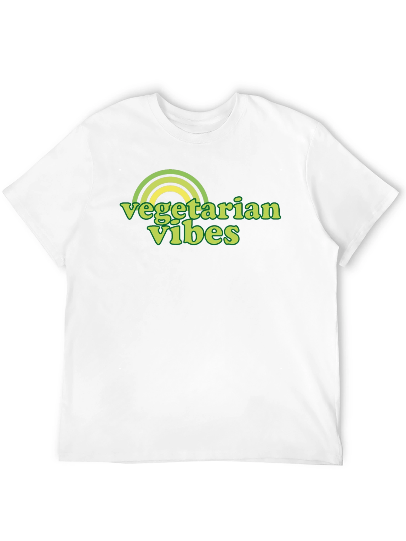 Embrace a plant-based lifestyle with this stylish black T-shirt. Featuring a vibrant "Vegetarian Vibes" design, it adds a playful and positive touch to any outfit. The graphic incorporates a rainbow in shades of green and yellow, lending a retro, earthy vibe. The shirt is made from a comfortable material, perfect for everyday wear. Show off your commitment to vegetarianism in style whether you're at a casual gathering, running errands, or simply relaxing at home. It's more than just a shirt, it's a statement! This cool tee is a must-have for vegetarians and those who love healthy eating.