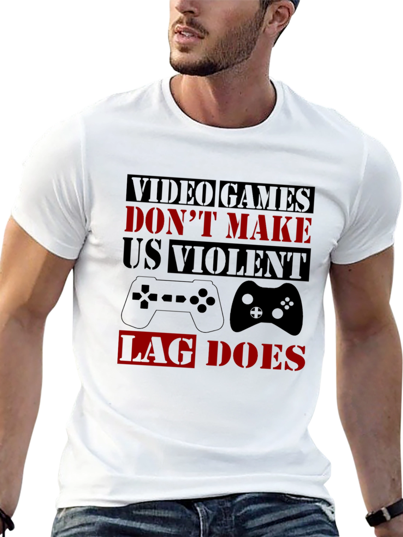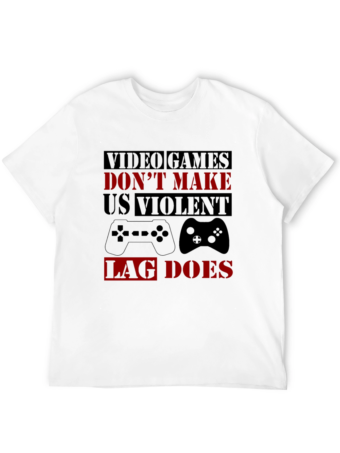 Declare your true feelings about online gaming with this bold graphic t-shirt. The black tee features the statement 'Video Games Don't Make Us Violent, Lag Does' in an eye-catching combination of block red and black lettering. Two classic controller designs are also printed on the shirt. Perfect for casual wear, gaming meetups, or as a fun gift for the gamer in your life. This durable tee is sure to be a conversation starter and a comfortable addition to any wardrobe. Express your passion for gaming!