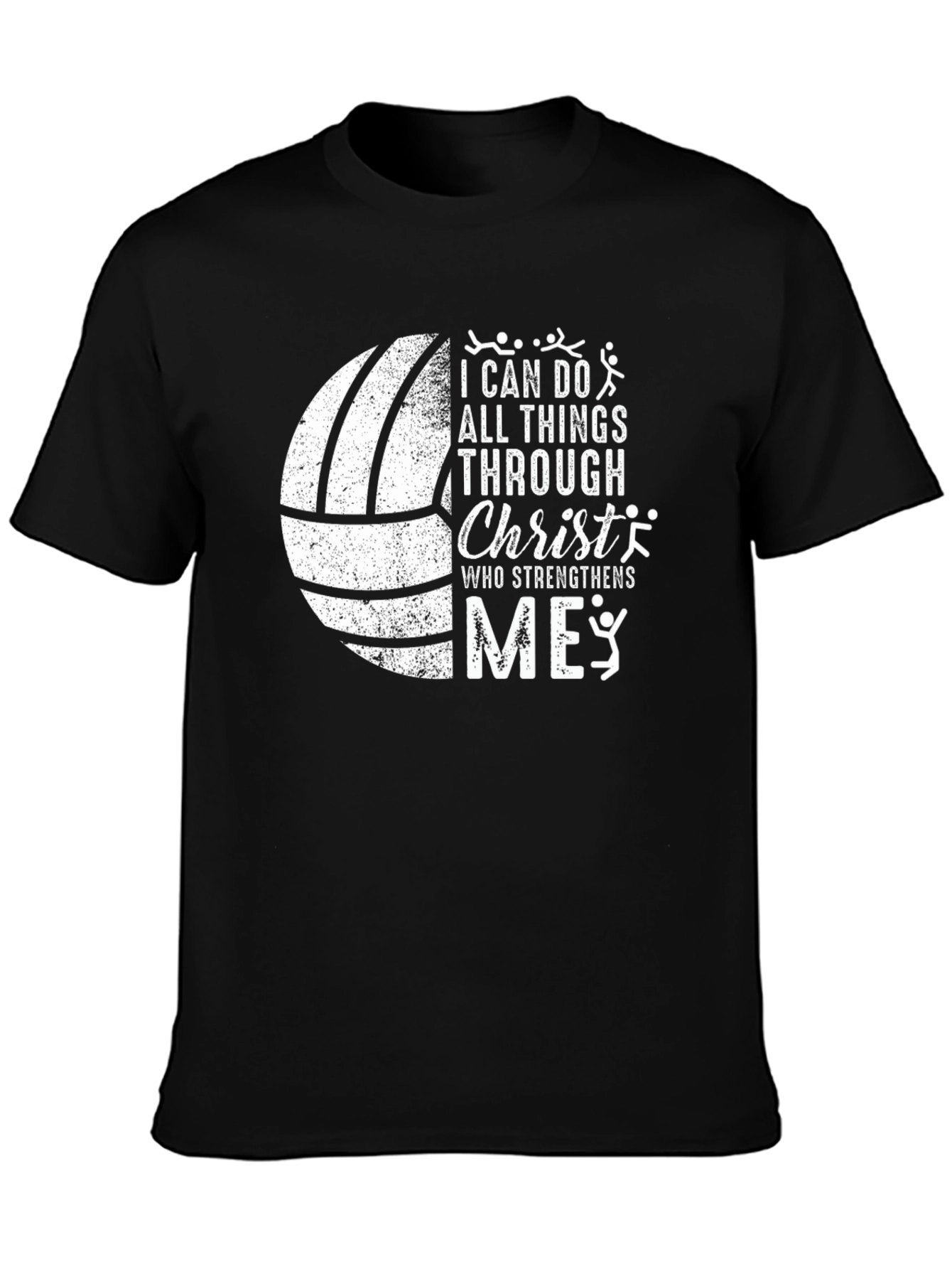 Showcase your faith and love for volleyball with this unique black t-shirt! Featuring a half-volleyball design paired with the inspiring message "I can do all things through Christ who strengthens me," this tee is perfect for players and fans alike. The distressed print gives it a vintage, stylish look. Made from comfortable, breathable fabric, it's ideal for casual wear, workouts, or showing team spirit. A great conversation starter, this shirt combines sport and spirituality in a bold and meaningful way. Get yours today and inspire others on and off the court!