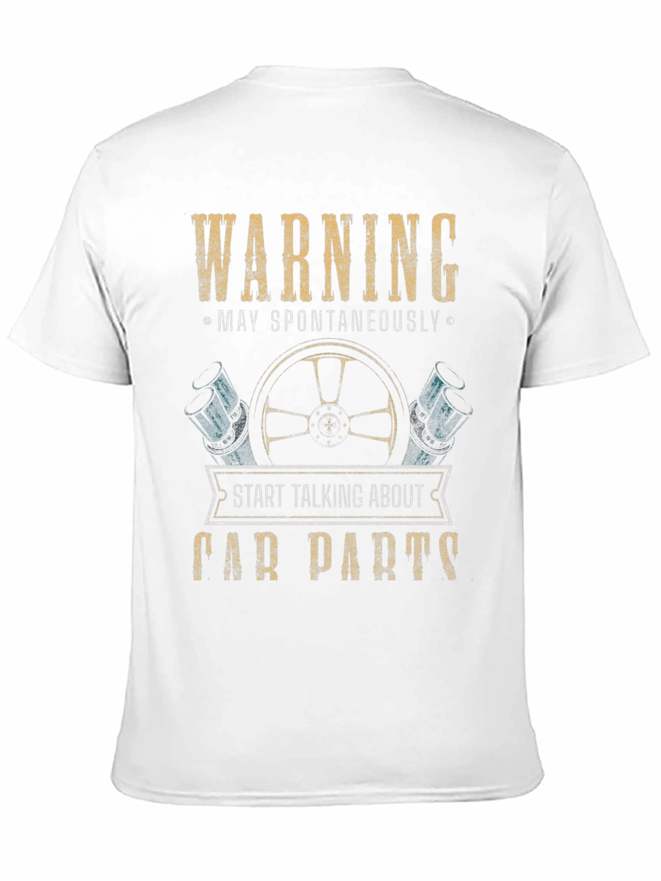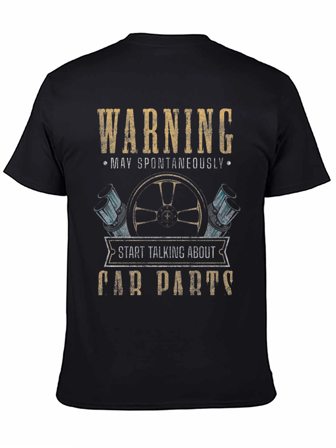 Show off your passion for automobiles with this eye-catching t-shirt. The shirt features a bold graphic design with the phrase "WARNING MAY SPONTANEOUSLY START TALKING ABOUT CAR PARTS." It also features a wheel rim graphic and tool images. The shirt is made from comfortable materials that are soft to the touch and breathable. The black color will help make the graphic stand out. This t-shirt is a great conversation starter and is perfect for car enthusiasts. Wear it to car shows, mechanic shops, or just around town to show off your love of cars. Get yours today!