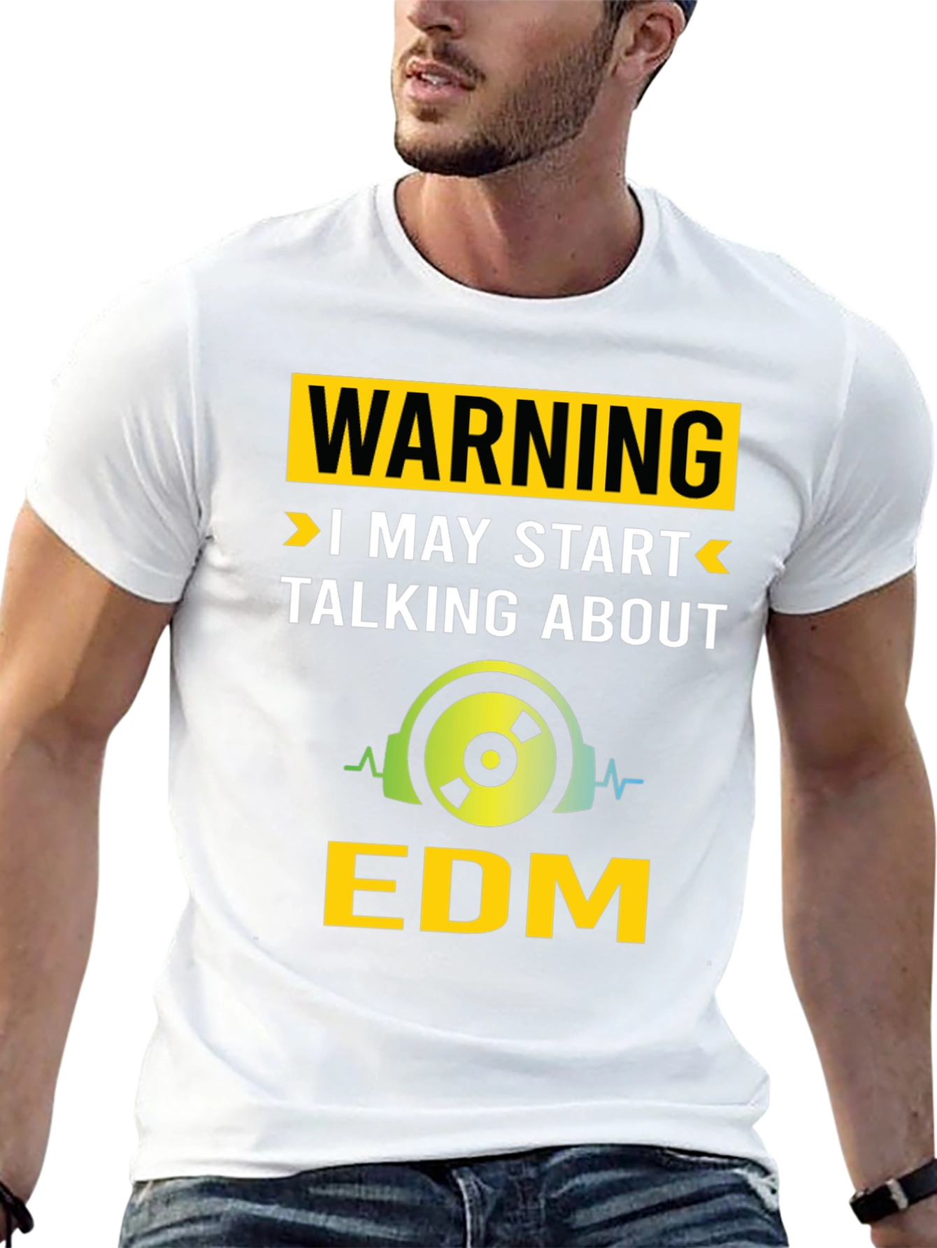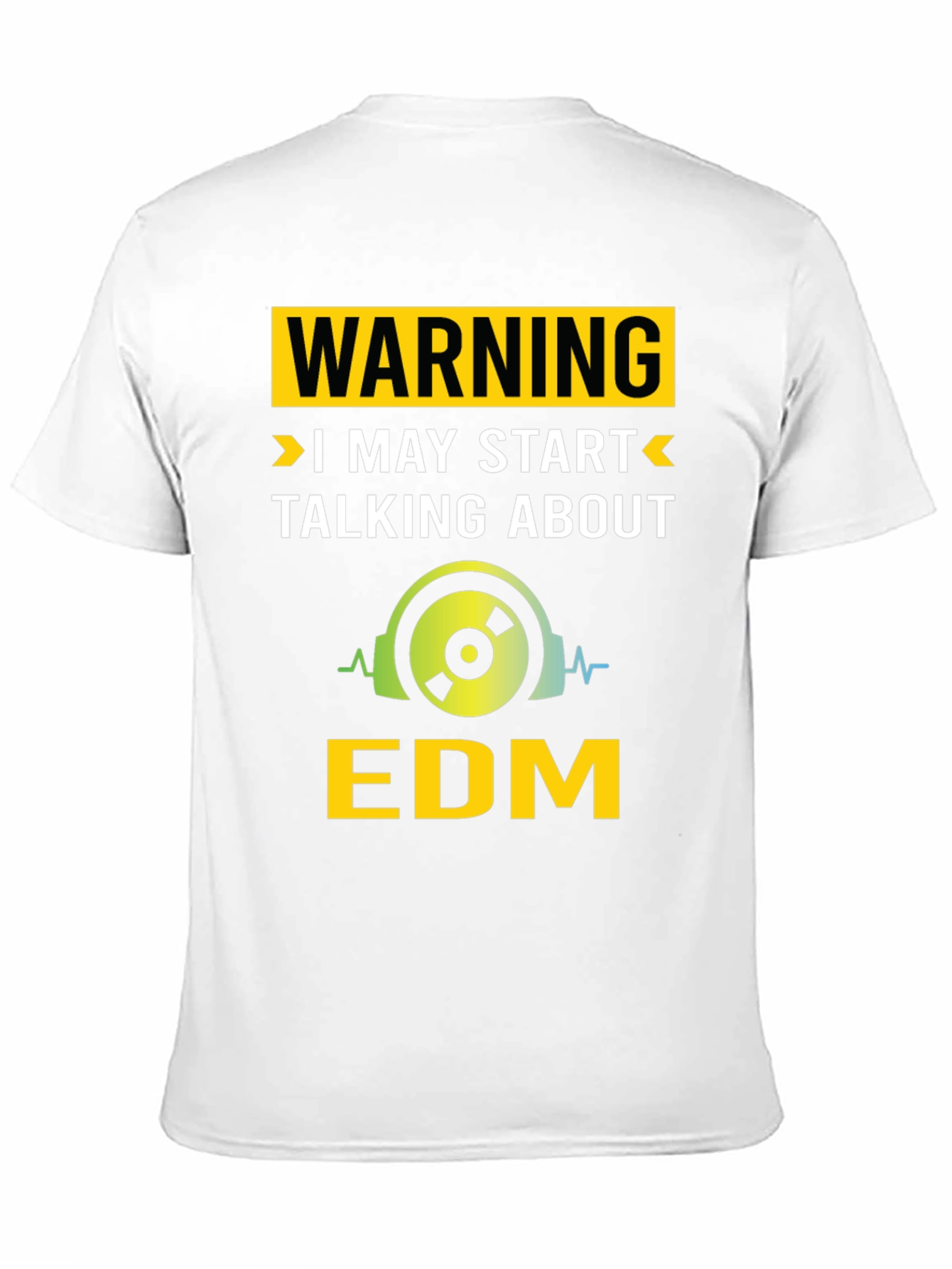 Showcase your love for electronic dance music with this bold and eye-catching t-shirt. This black t-shirt features a vibrant yellow and green design that includes a warning message above a graphic of headphones. The text clearly states that you might start talking about EDM, making it a fun conversation starter for fellow music enthusiasts. Made from a comfortable, breathable fabric, this tee is perfect for casual wear, music festivals, or any event where you want to express your passion for EDM. It's a must-have for DJs, producers, and anyone who loves the beats!