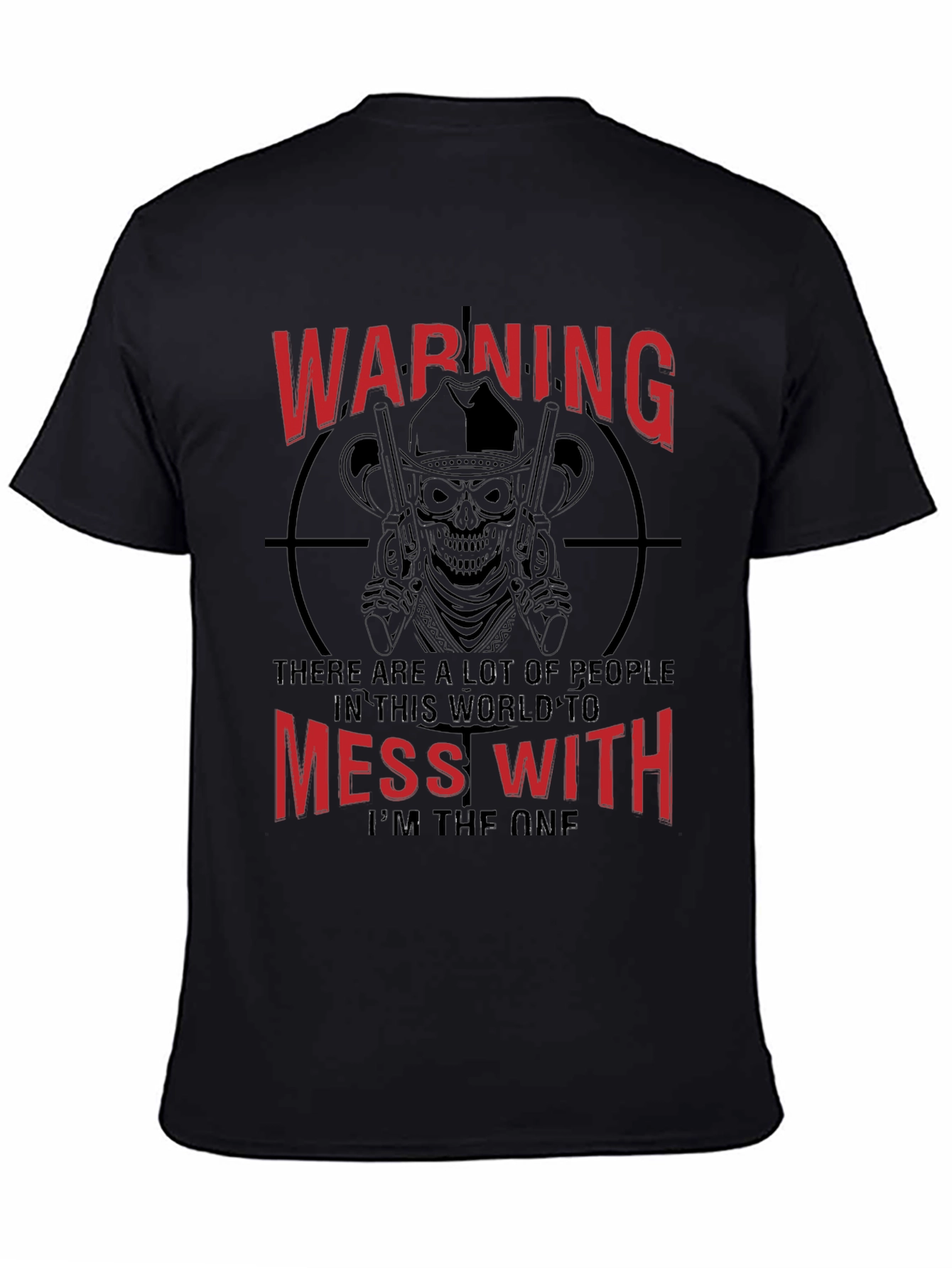 Make a statement with this bold black t-shirt featuring a striking graphic print. The design includes the word 'WARNING' above a skull wearing a cowboy hat and holding two guns, all set against a target backdrop. Bold lettering states 'THERE ARE A LOT OF PEOPLE IN THIS WORLD TO MESS WITH I'M THE ONE'. Crafted from what appears to be soft, breathable cotton, this tee offers both comfort and style. Perfect for casual wear, concerts, or adding an edgy touch to your everyday look. Show off your personality with this unique graphic tee!