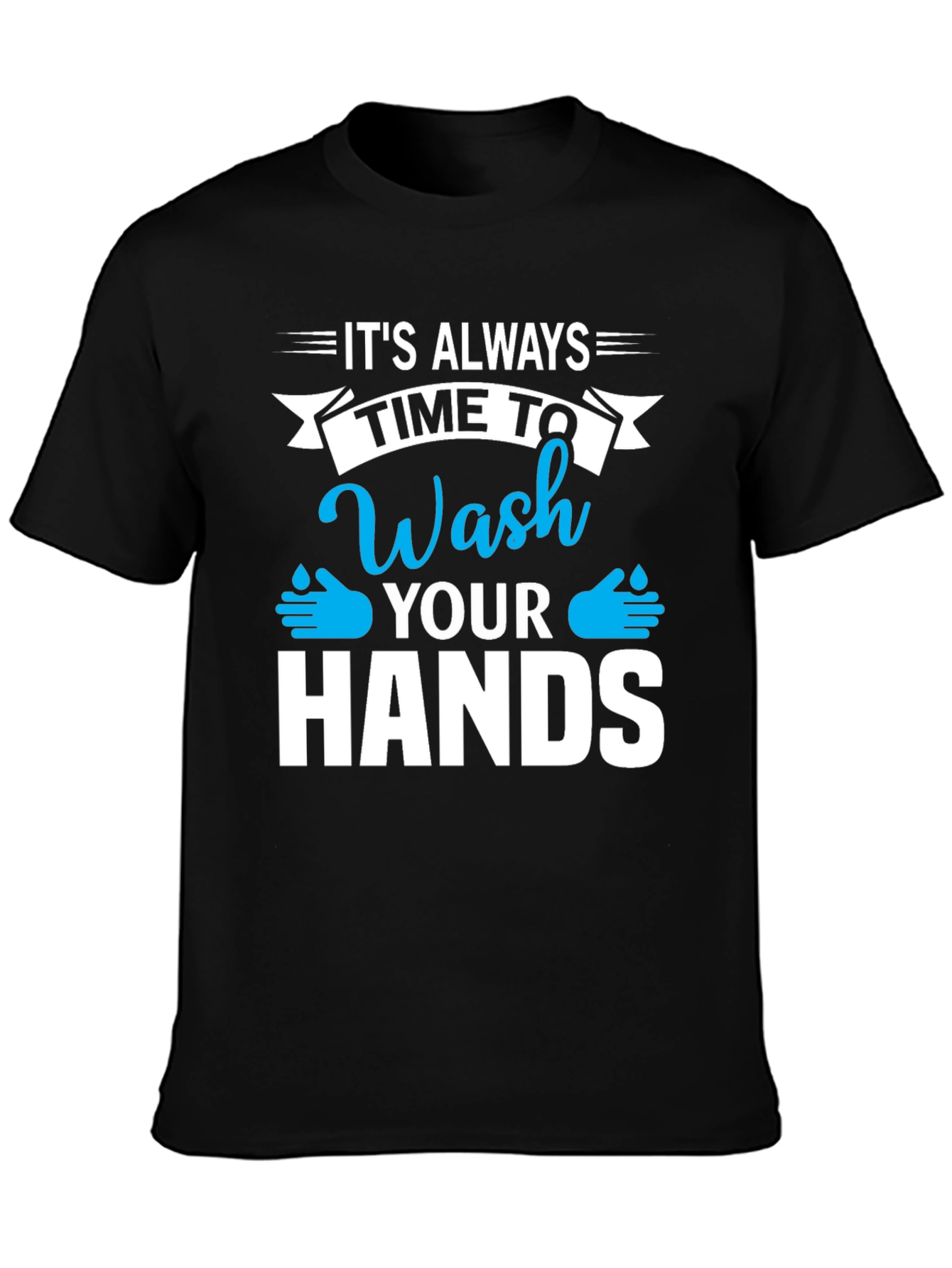 Stay healthy and spread the message with this stylish black t-shirt. The design features the phrase "It's Always Time to Wash Your Hands" in a combination of white and teal lettering. A classic crew neck and comfortable fit make it perfect for everyday wear. Show your commitment to cleanliness and hygiene while looking great. Ideal for healthcare workers, teachers, or anyone who wants to promote good habits. Available in various sizes.