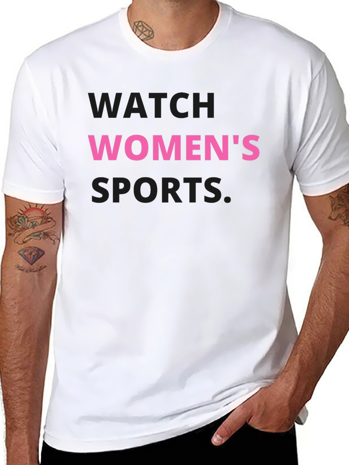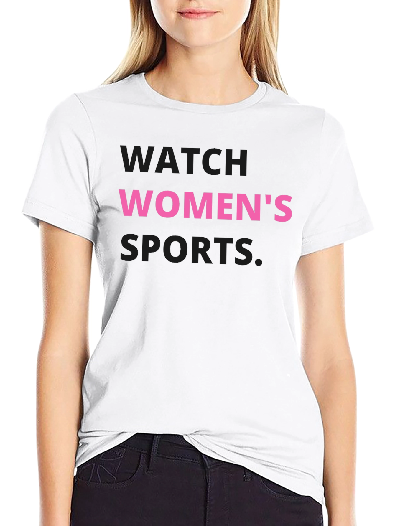 This classic black t-shirt makes a statement with its bold, graphic print. The text "WATCH WOMEN'S SPORTS." is prominently displayed, featuring the word 'WOMEN'S' in vibrant pink. Crafted from a soft, comfortable fabric, this tee is perfect for casual wear. Show your support for women's athletics with this stylish and impactful piece. Ideal for everyday wear, sports events, or as a gift for sports enthusiasts. Comfortable and stylish, this tee is a great addition to any wardrobe.