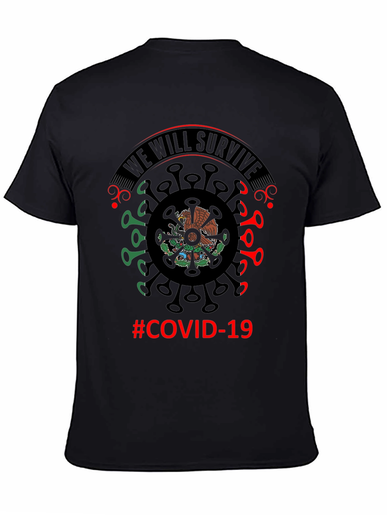 Show your resilience with this unique black t-shirt featuring a striking graphic design. The design incorporates the Mexican flag's colors and emblem within a stylized COVID-19 molecule, encircled by the powerful message 'We Will Survive' . Made from a comfortable-looking fabric, this shirt is perfect for everyday wear, demonstrating hope and solidarity during challenging times. Ideal for those with a connection to Mexico or anyone who wants to express a positive outlook. Wear it proudly to support your community and make a statement of strength.