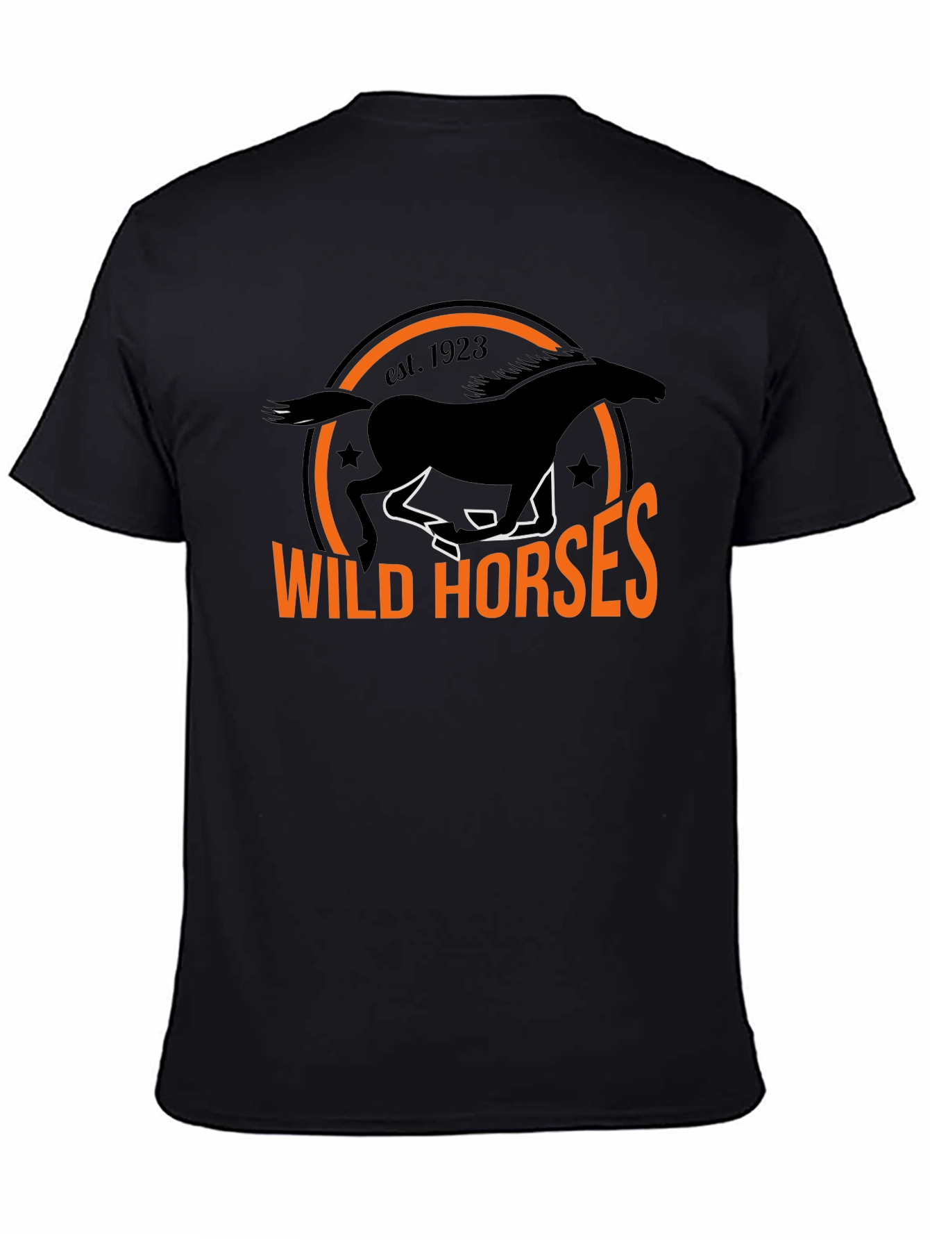 Show off your love for the wild with this striking black tee. The design features a bold graphic of a galloping horse inside a retro-style circular logo. It also includes "est. 1923" at the top and "WILD HORSES" printed below the horse in an eye-catching orange color. Made from comfortable, breathable fabric, this t-shirt is perfect for casual wear or outdoor adventures. Pair it with jeans or shorts for a relaxed, cool look. A must-have for horse enthusiasts and those who appreciate unique graphic tees.