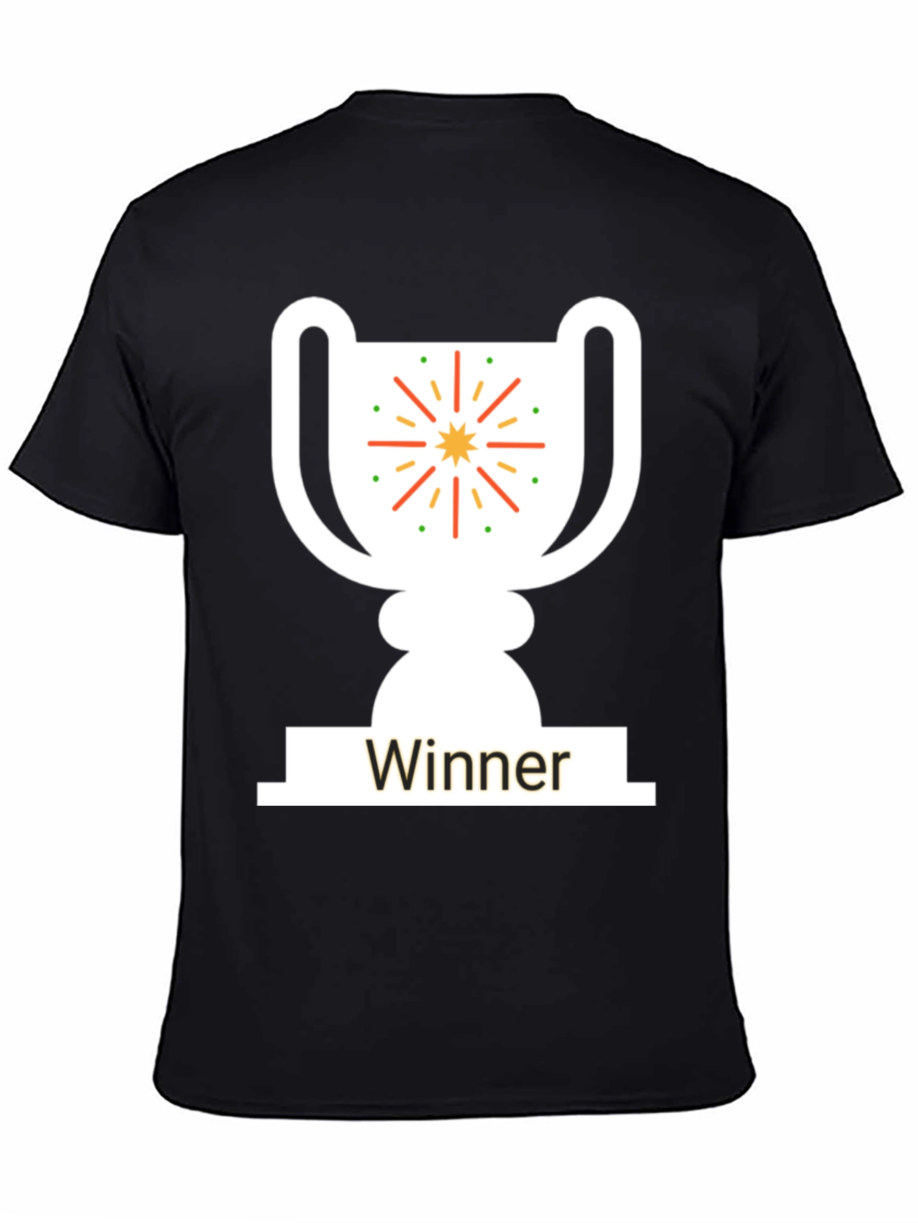 Celebrate success with this stylish black t-shirt featuring a bold winner trophy graphic. The design includes a white trophy silhouette, complete with celebratory starburst accents in orange and green. The word "Winner" is prominently displayed on the trophy's base. Made from comfortable, breathable fabric, this tee is perfect for casual wear, sports events, or as a gift for champions. Show off your winning spirit with this eye-catching and unique t-shirt. Get yours today!