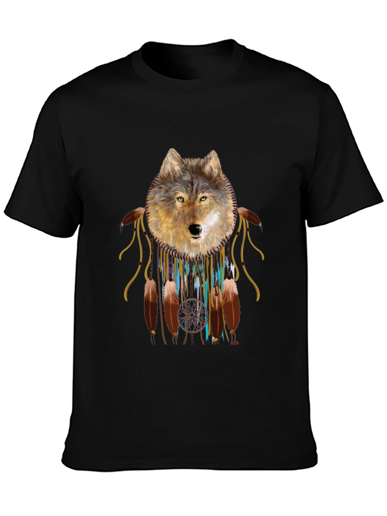 Embrace your wild side with this striking black t-shirt featuring a captivating wolf graphic. The design showcases a majestic wolf head intricately intertwined with a native american dreamcatcher motif complete with hanging feathers. The gold color adds a touch of warmth and earthiness to the design, making it a unique statement piece. Made from a comfortable, breathable cotton blend, this tee is perfect for everyday wear. Whether you're exploring the outdoors or simply expressing your individual style, this wolf dreamcatcher tee is an excellent choice. It's a versatile addition to any wardrobe and a great conversation starter.