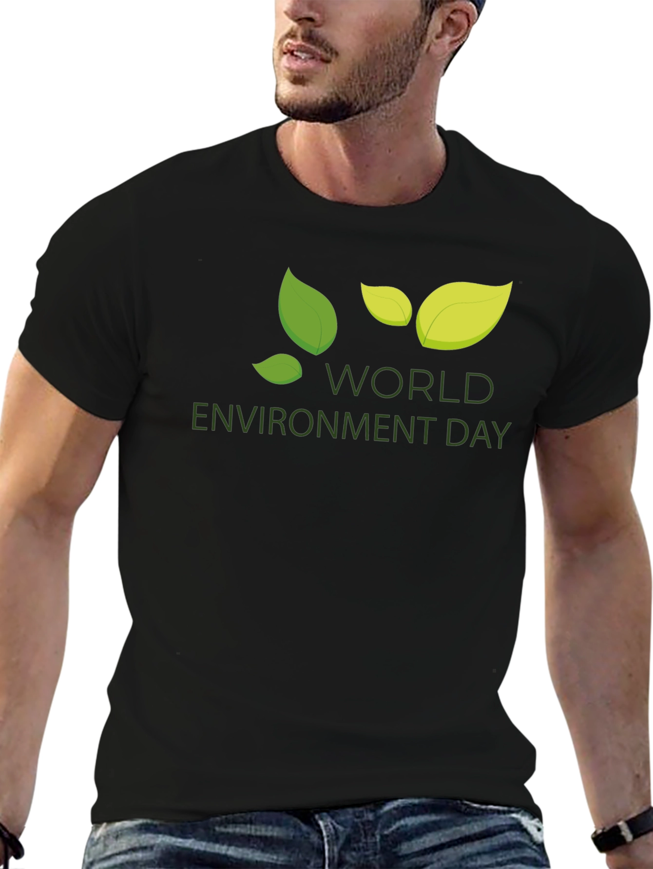 Show your support for our planet with this stylish black t-shirt featuring a vibrant "World Environment Day" design. The graphic incorporates a series of green leaves, symbolizing growth and nature. This comfortable and eye-catching shirt is perfect for raising awareness and promoting environmental consciousness. Made from what appears to be soft, breathable cotton, this classic fit tee ensures all-day comfort. The design is printed with high-quality inks for a long-lasting and vibrant finish. Wear it to rallies, environmental events, or simply as a daily reminder to protect our earth.