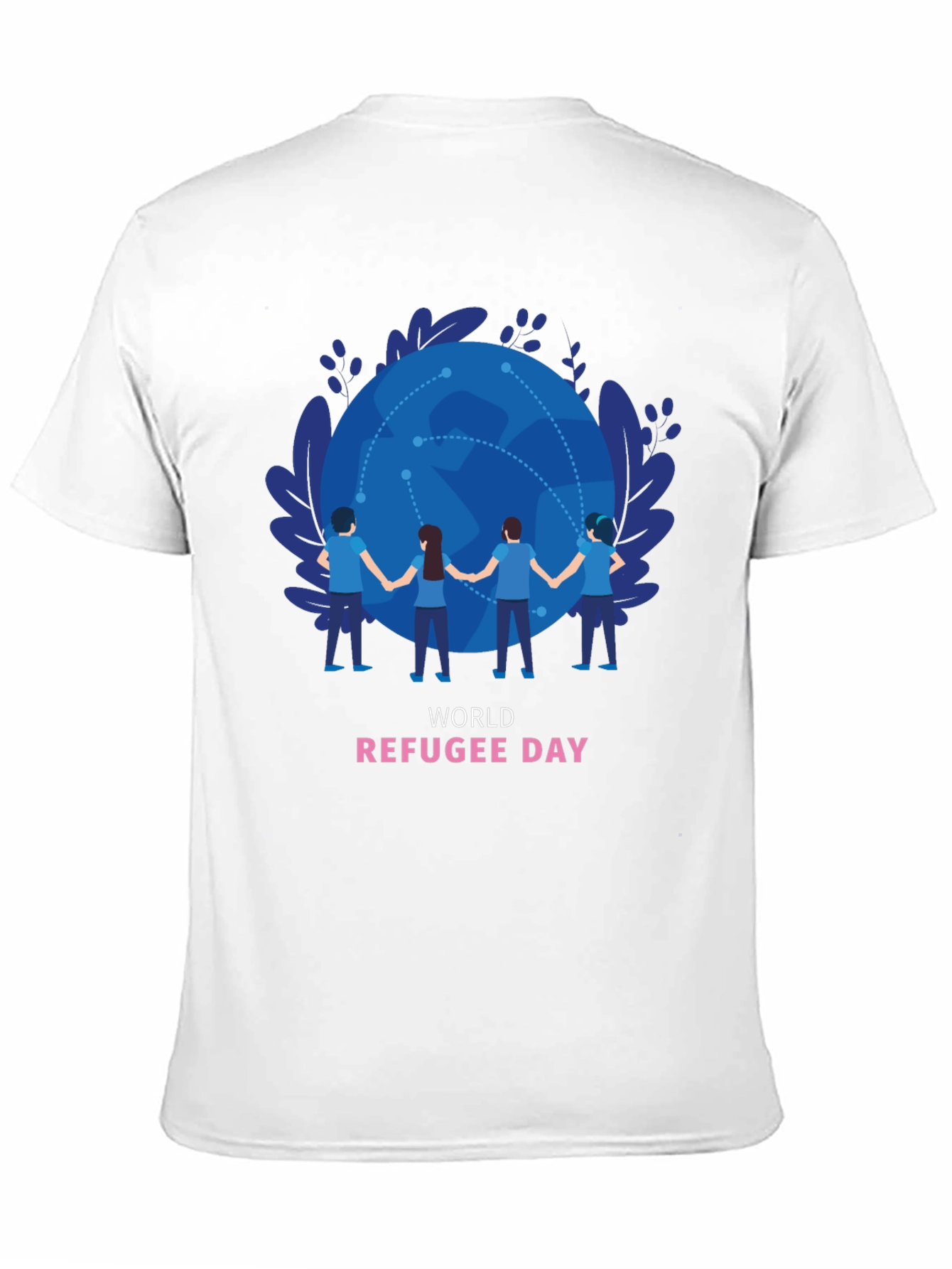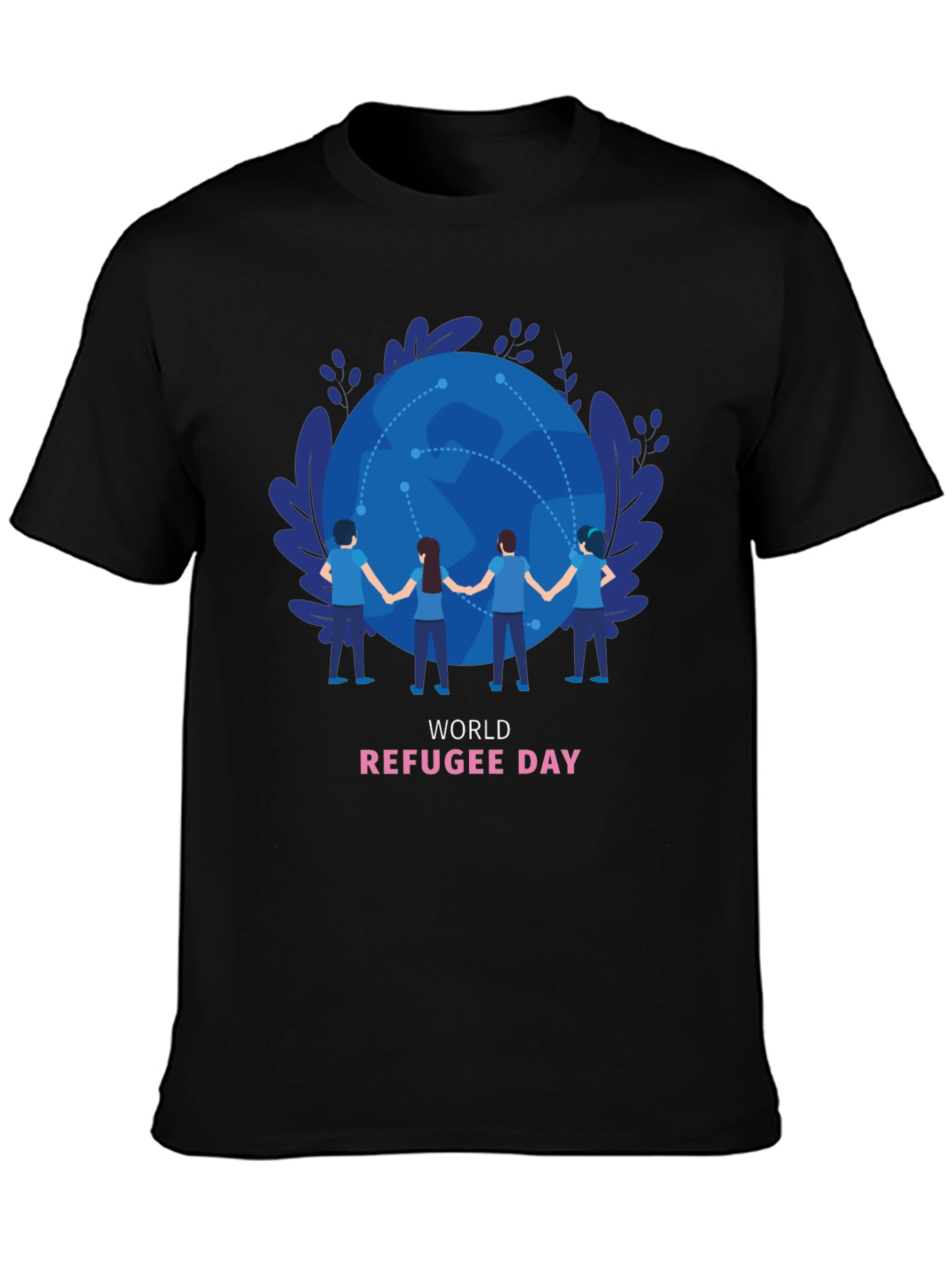Show your support with this black World Refugee Day T-shirt. The design features a blue globe surrounded by stylized blue foliage, with people holding hands connecting different points on the globe. The words "WORLD REFUGEE DAY" are printed below in pink. Made from comfortable materials, this tee is perfect for raising awareness and promoting unity. Wear it to events, rallies, or as a daily reminder of our shared humanity. Makes a thoughtful gift for advocates and allies. Available in various sizes. Stand in solidarity and make a statement with this eye-catching and meaningful tee!