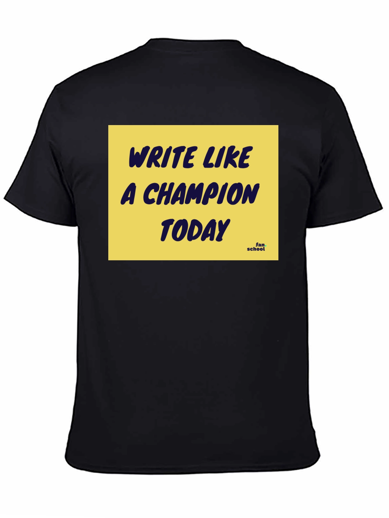 Show your winning spirit with this bold black t-shirt. The vibrant design features the motivational phrase "Write Like a Champion Today" in striking navy lettering against a sunny yellow background. Made from comfortable material, this classic fit tee is perfect for casual wear or to inspire creativity. Whether you're at school, home, or out and about, let this shirt remind you to always strive for success! It also subtly represents “fan school.” Grab yours and start writing your own champion story!
