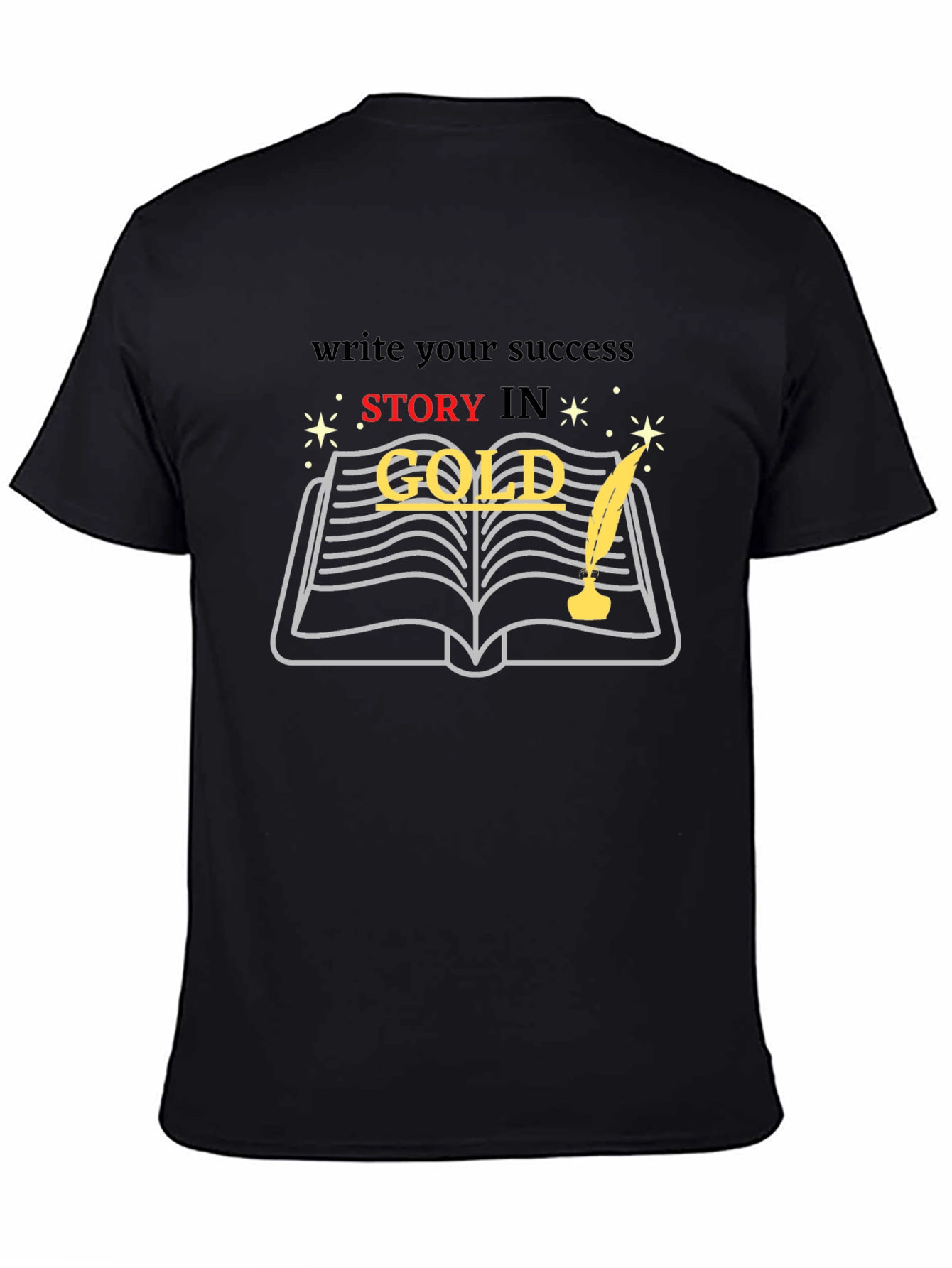 Make a statement with this stylish black t-shirt featuring a motivational design. The shirt displays the text "Write your success story in gold", accompanied by an image of an open book and quill, evoking creativity and inspiration. Perfect for writers, dreamers, and anyone looking to add a touch of motivation to their wardrobe. Crafted from comfortable material, this tee offers a great fit and is ideal for everyday wear. Whether you're heading to class, meeting friends, or working on your next big project, this t-shirt will keep you feeling confident and inspired. Add a unique piece to your collection that sparks conversations and reflects your drive.
