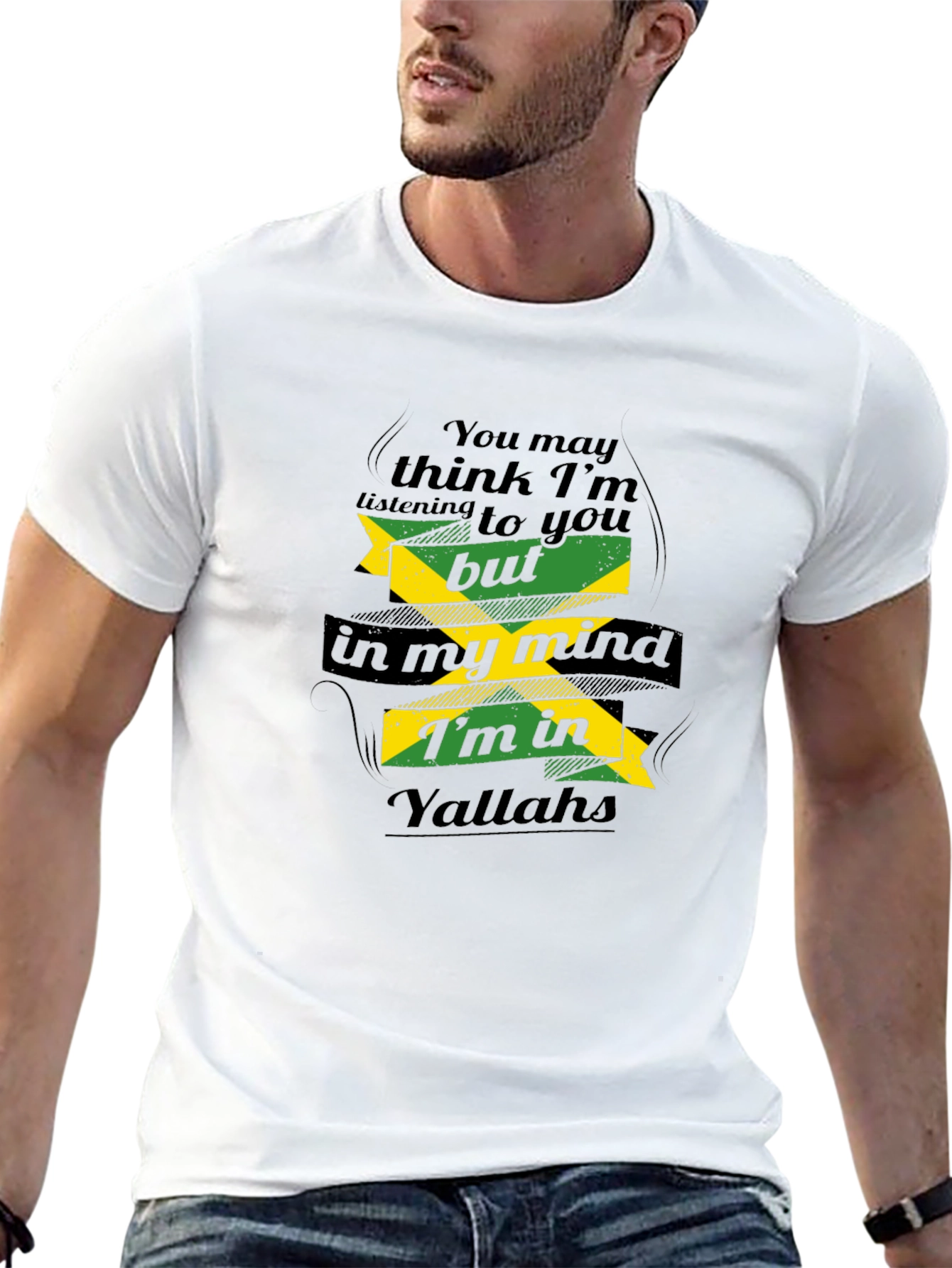 Show your love for Yallahs, Jamaica with this stylish black t-shirt. The shirt features a bold graphic design with the phrase "You may think I'm listening to you but in my mind I'm in Yallahs" displayed on Jamaican flag-colored banners. Crafted from a comfortable material, this tee offers a relaxed fit for everyday wear. Perfect for casual outings, vacations, or as a unique gift for Jamaica enthusiasts. Express your love for travel and island vibes with this statement piece.