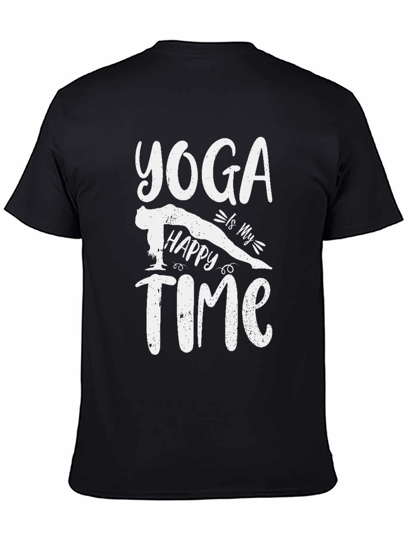 This black t-shirt features a fun and stylish design perfect for yoga enthusiasts. The graphic boldly states "YOGA Is My HAPPY TIME" in distressed white lettering, accompanied by a silhouette of a yoga pose. This tee is made from what appears to be comfortable cotton material, making it ideal for workouts or casual wear. The dark color is versatile and easy to match with any outfit. Show off your love for yoga and enjoy the comfort and style of this unique t-shirt. This tee is perfect for wearing to your favorite yoga class, running errands, or lounging around the house.