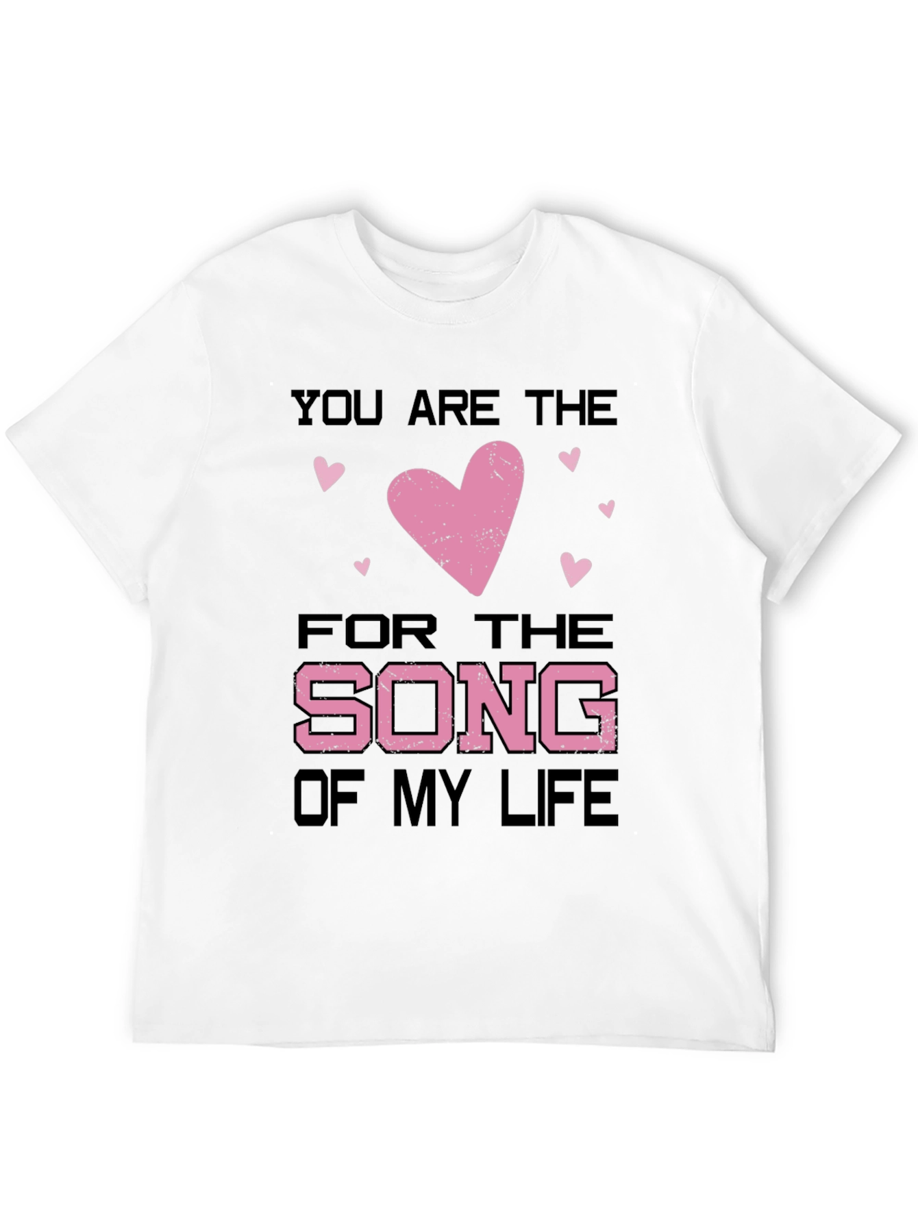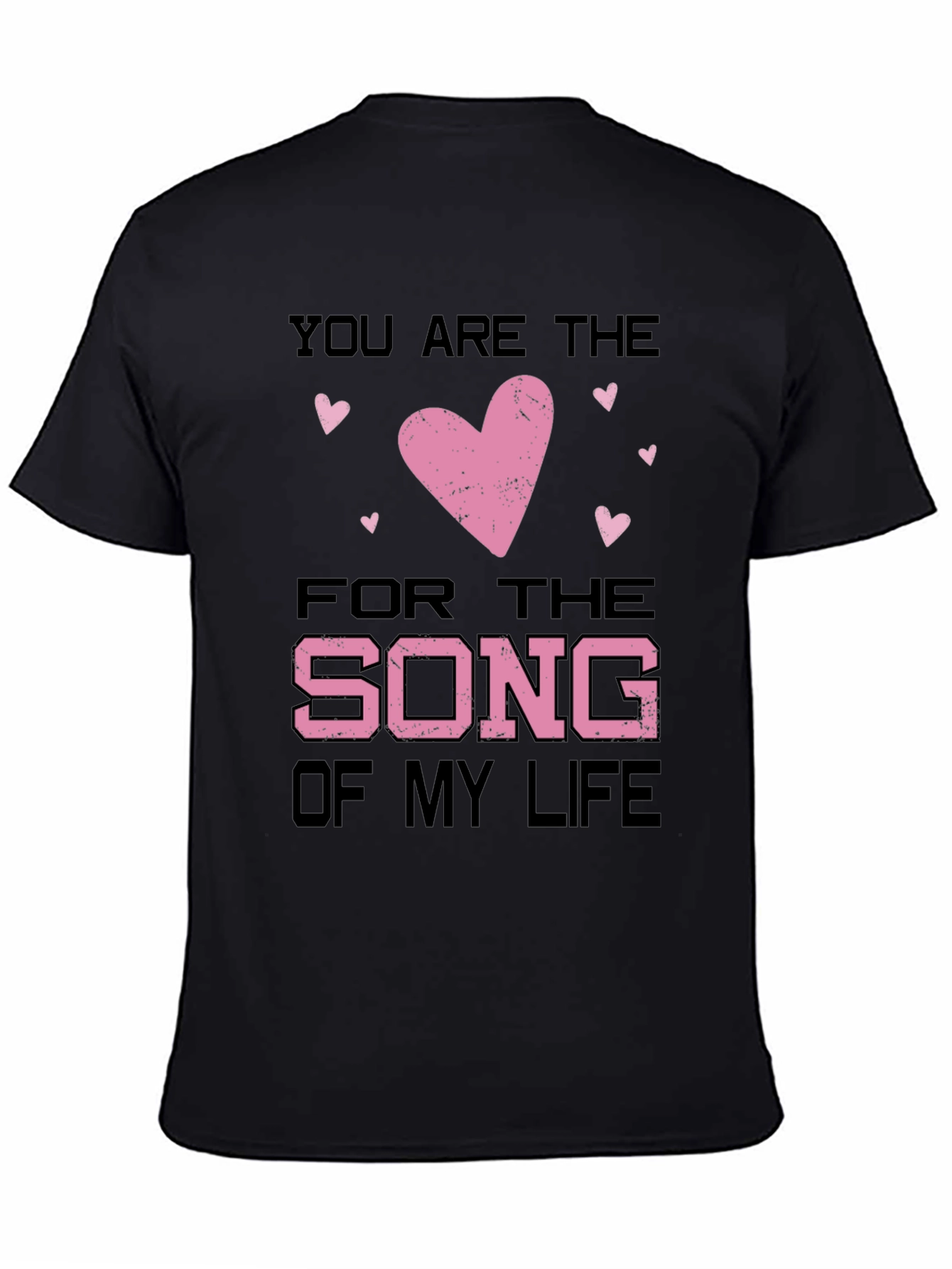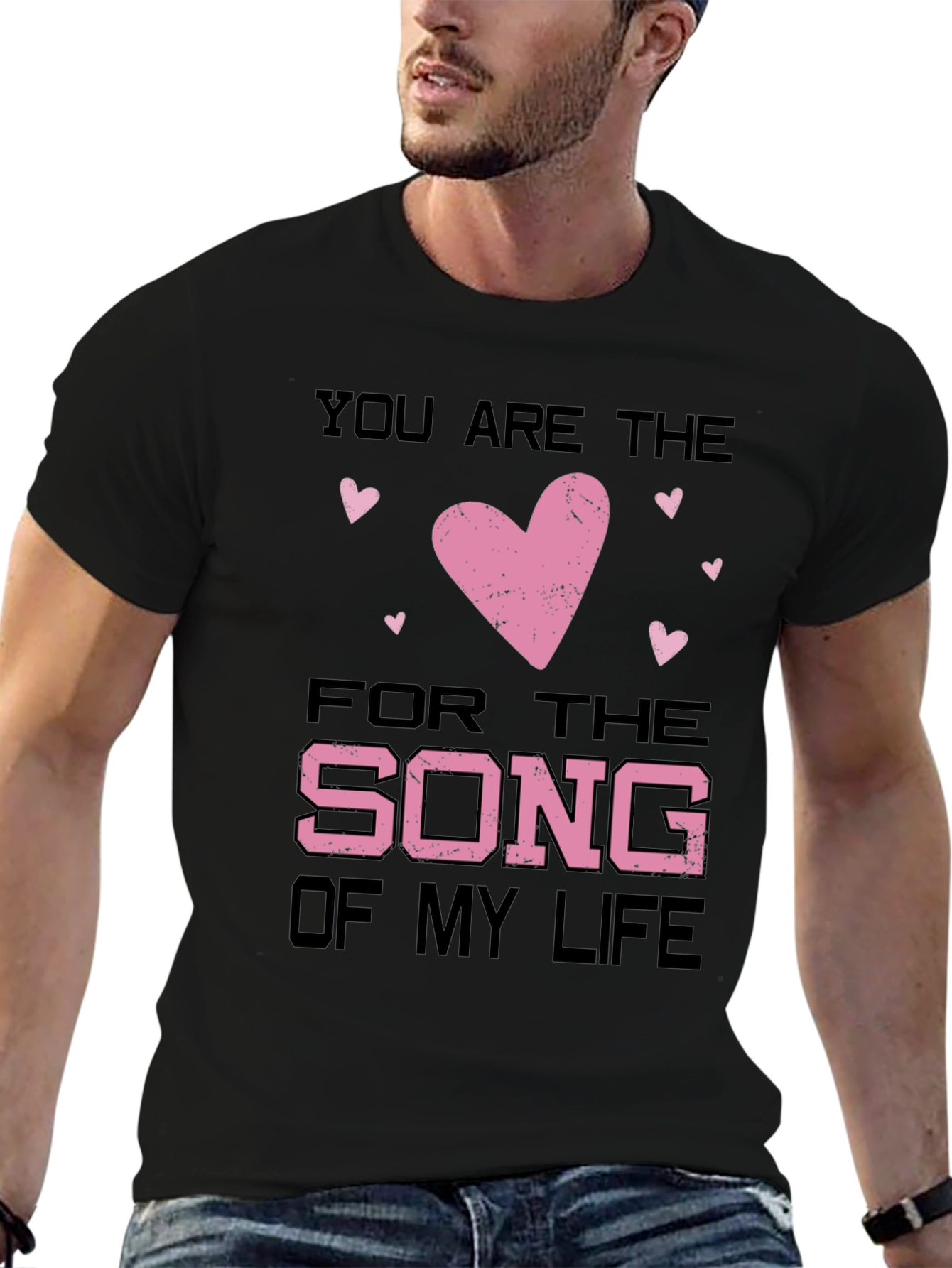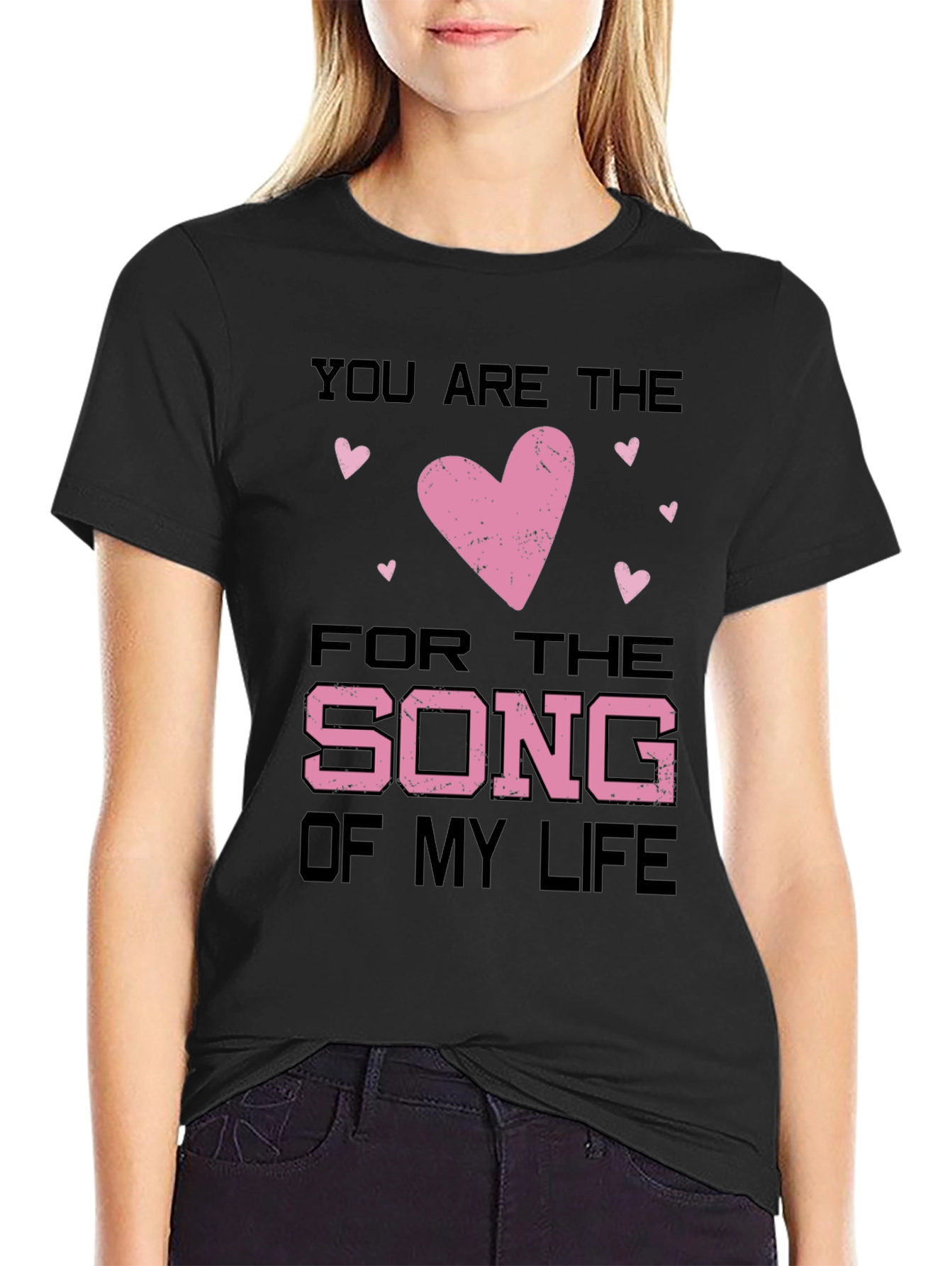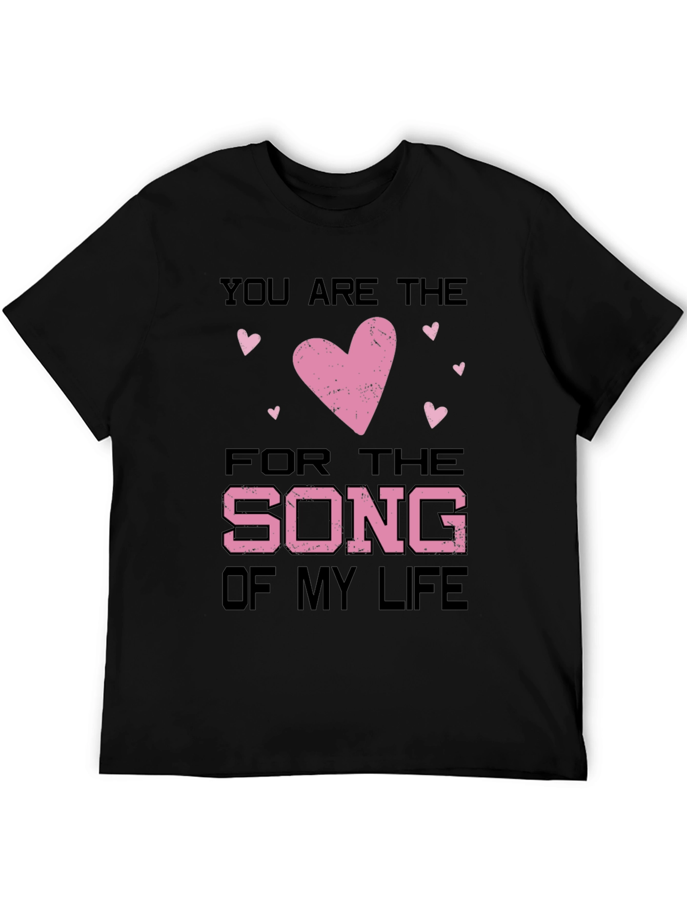Declare your love with this stylish black t-shirt! It features the romantic message "You Are The Song Of My Life", adorned with pink hearts. The design has a distressed, vintage feel, making it a trendy choice for casual wear. Made from a comfortable-looking fabric, this shirt is perfect for Valentine's Day, anniversaries, or just to show your affection. Pair it with jeans for a relaxed, everyday look, or dress it up with a jacket for a night out. A great gift for the music lover in your life!