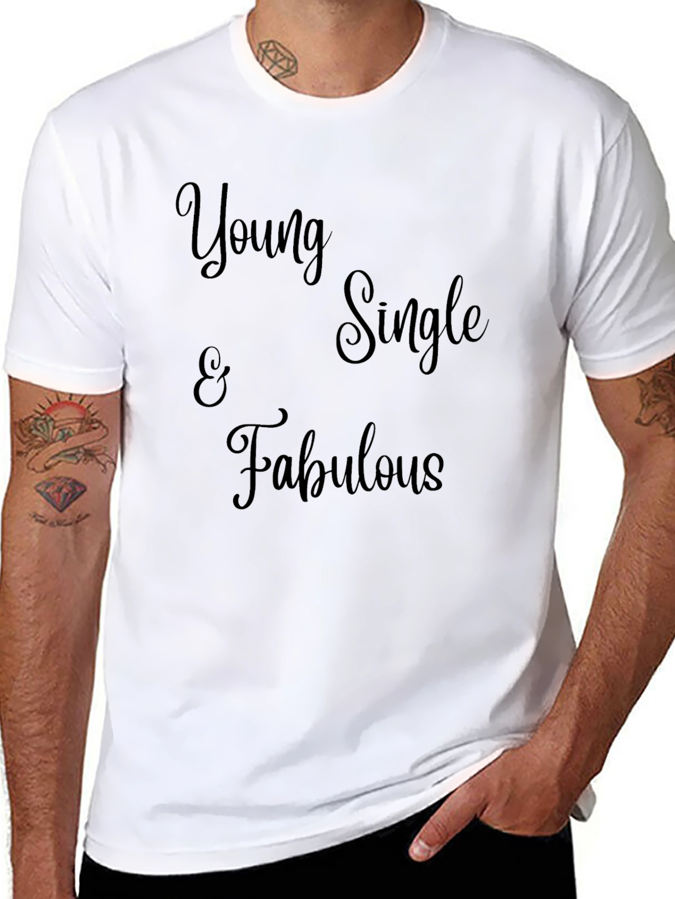 Show off your fun and flirty side with this stylish black t-shirt! The shirt features the words "Young Single & Fabulous" in a sleek, cursive font. This tee is made from a soft, comfortable material and boasts a classic crew neck and short sleeves, making it perfect for casual outings, parties, or everyday wear. Pair it with your favorite jeans or a skirt for a chic, effortless look that radiates confidence and charm. Embrace your fabulousness and make a statement with this must-have wardrobe addition.